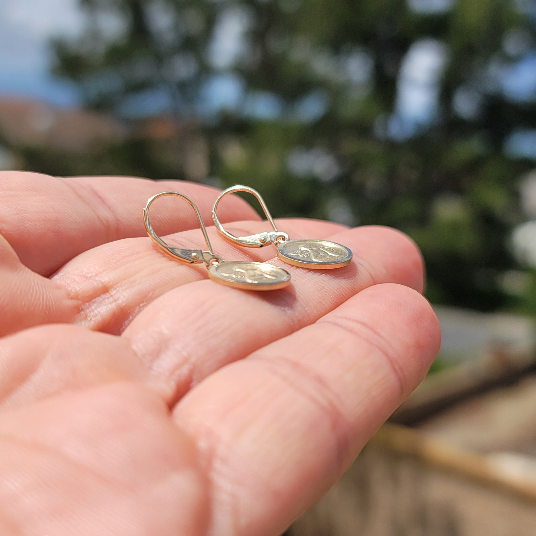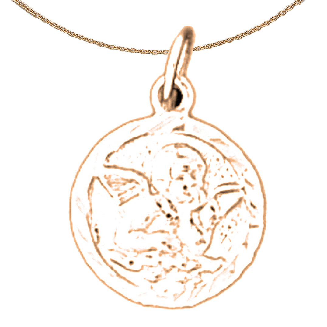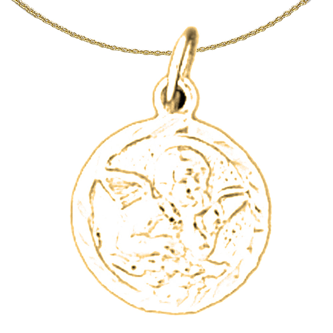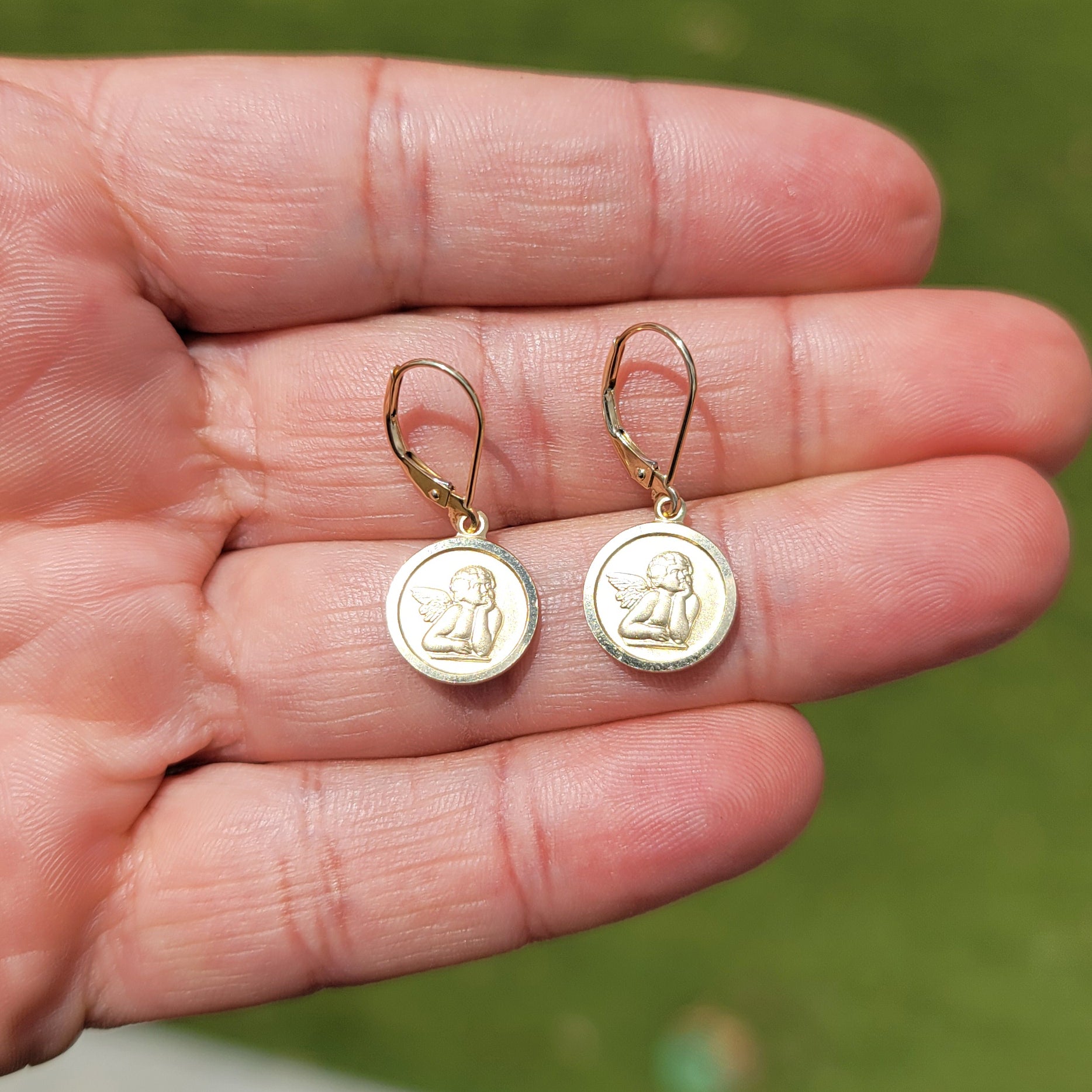Dies ist ein eleganter Engelsmünzanhänger aus 14- oder 18-karätigem Gold. Dieser Anhänger aus 14- oder 18-karätigem Gold ist 16 mm lang und 12 mm breit. Die Maße umfassen den Ring. JewelsObsession stellt alle Goldschmuckstücke in unserer hochmodernen Produktionsstätte her.