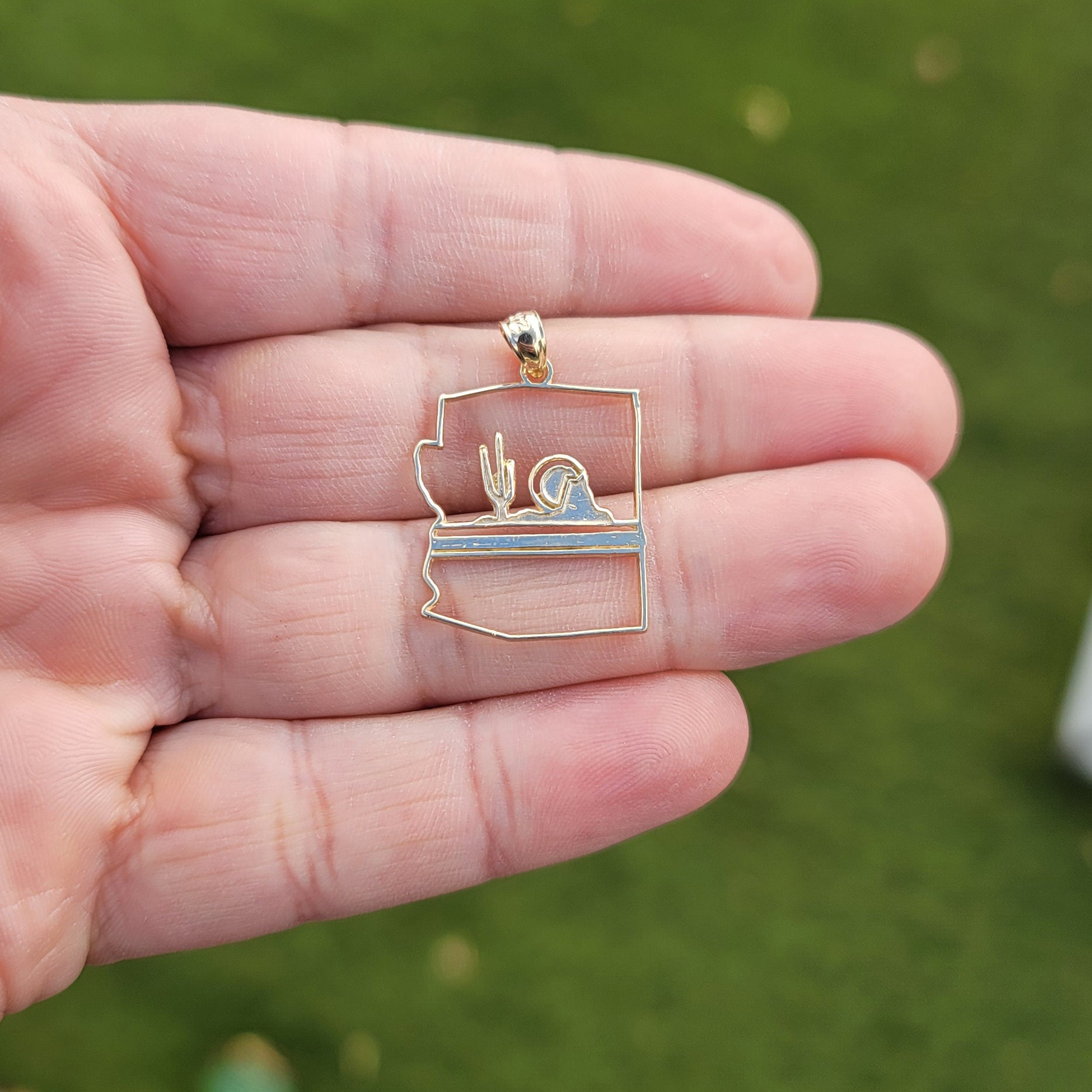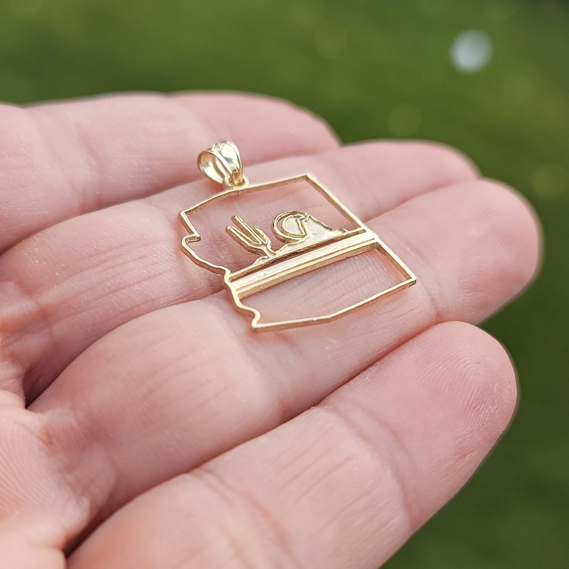 Dies ist ein atemberaubender Anhänger aus 14- oder 18-karätigem Gold aus New Mexico. Dieser Anhänger aus 14- oder 18-karätigem Gold ist 29 mm lang und 22 mm breit. Die Maße umfassen den Ring. JewelsObsession stellt alle Goldschmuckstücke in unserer hochmodernen Produktionsstätte her.
