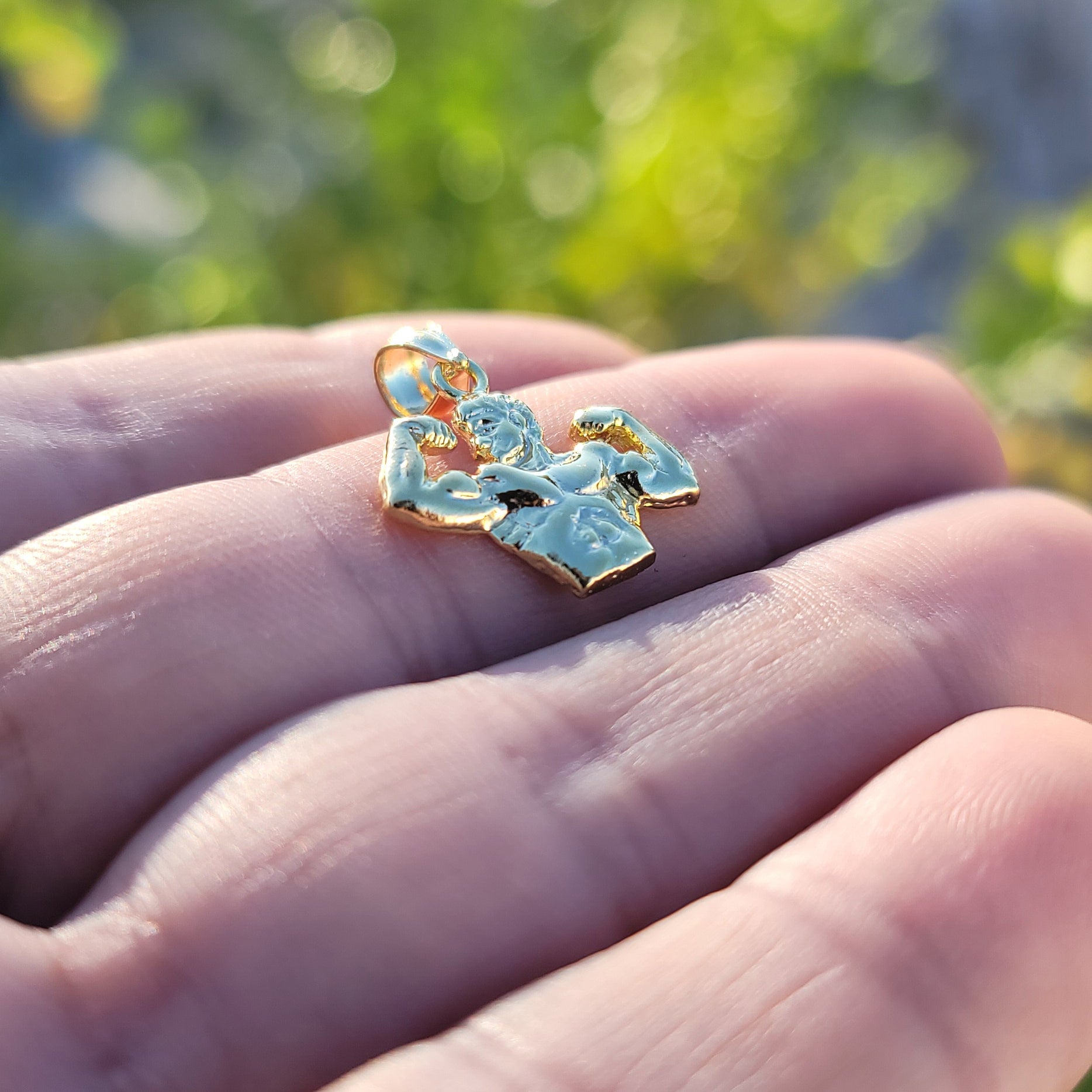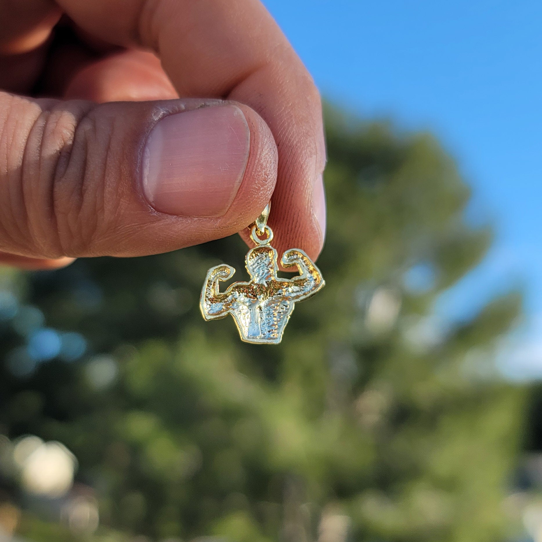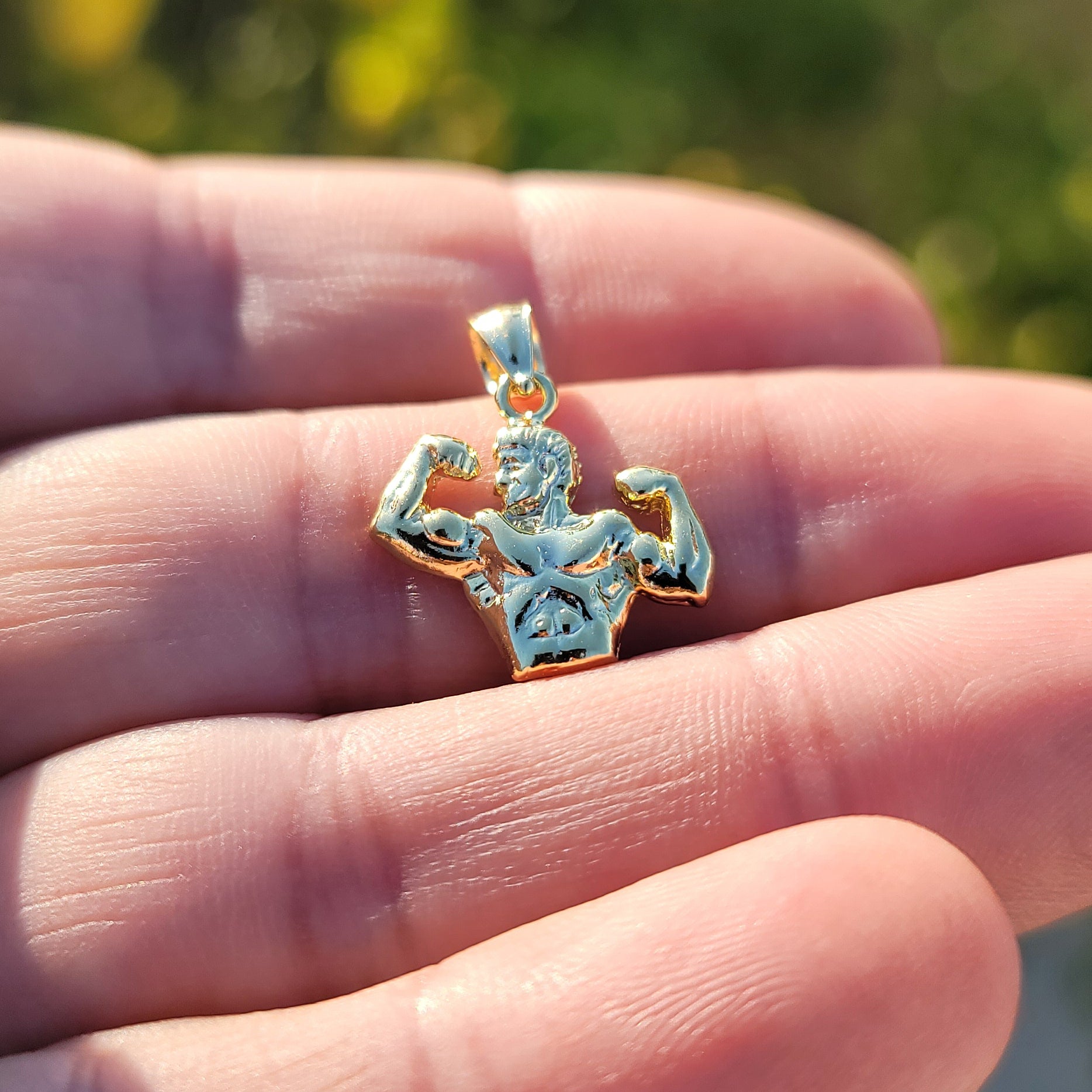 Dies ist ein eleganter Bodybuilder-Anhänger aus 14- oder 18-karätigem Gold. Dieser Anhänger aus 14- oder 18-karätigem Gold ist 20 mm lang und 18 mm breit. Die Maße umfassen den Ring. JewelsObsession fertigt alle Goldschmuckstücke in unserer hochmodernen Produktionsstätte.