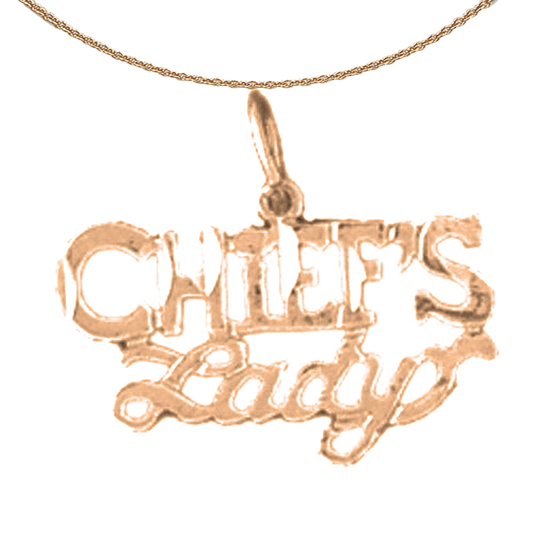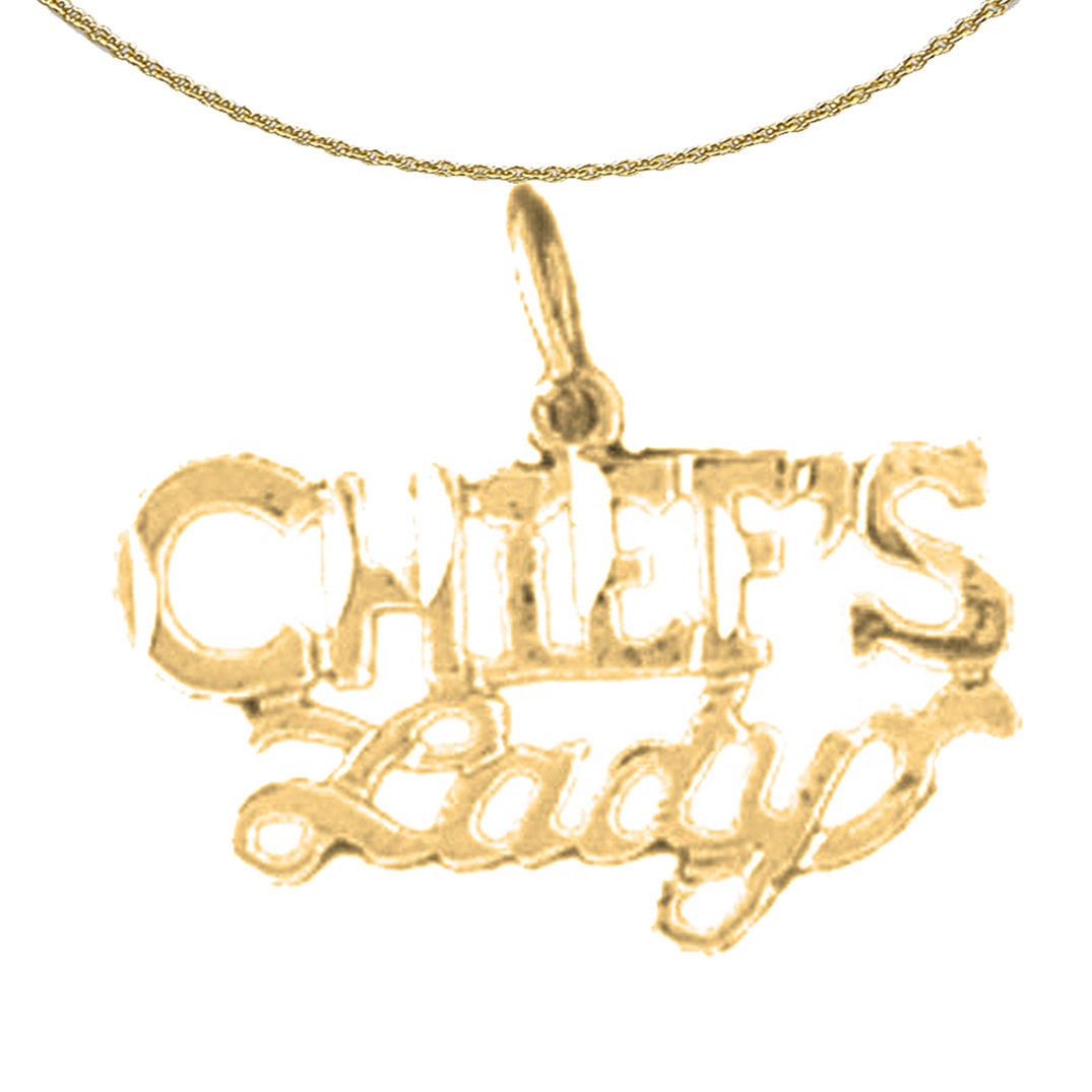 Dies ist ein eleganter 14K- oder 18K-Goldanhänger mit der Aufschrift „Chief's Lady“. Dieser 14K- oder 18K-Goldanhänger misst 18 x 20 x 30 cm. Die Maße umfassen den Ring. JewelsObsession fertigt alle Goldschmuckstücke in unserer hochmodernen Produktionsstätte.