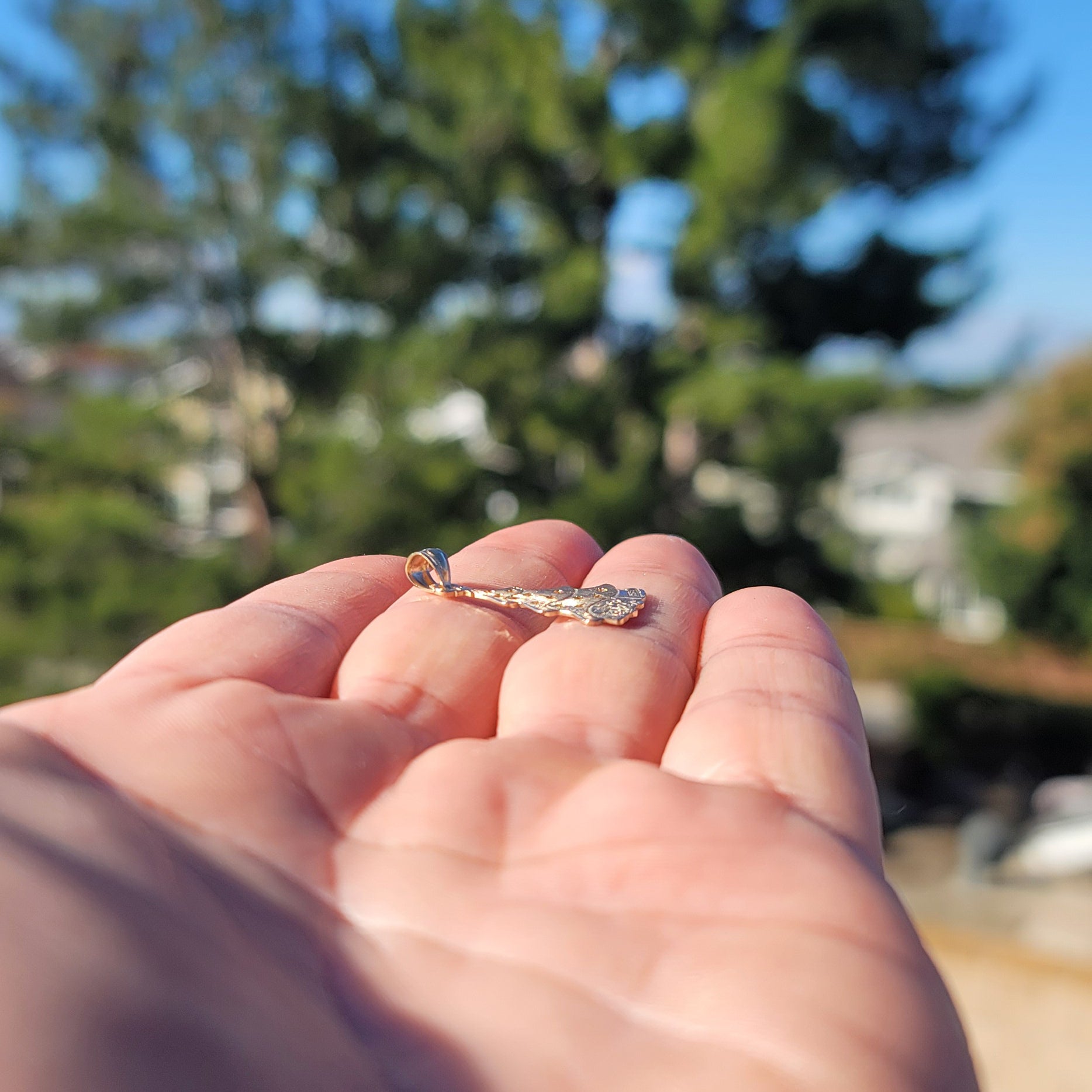 Optionale passende Kette: Ketten sind optional. Wählen Sie „Keine Kette“, um Ihrer Bestellung keine Kette hinzuzufügen. Wenn Sie eine Kettengröße auswählen, wird Ihrer Bestellung eine Kette in passender Farbe und Karat hinzugefügt. (Beispiel: Anhängerfarbe und Karatauswahl sind 14 Karat Rosé und eine 22-Zoll-Kette; Sie erhalten eine Kette und einen Anhänger aus 14 Karat Roségold.)