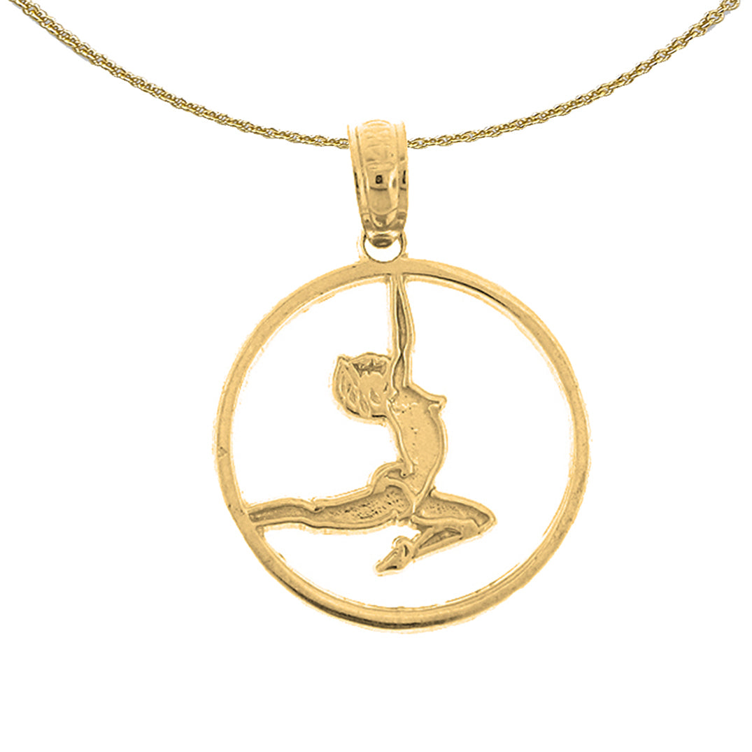 Dieser wunderschöne Anhänger aus 14- oder 18-karätigem Gold mit einer Turnerin ist 20 mm lang und 15 mm breit. Die Maße umfassen den Ring. JewelsObsession fertigt alle Goldschmuckstücke in unserer hochmodernen Produktionsstätte.