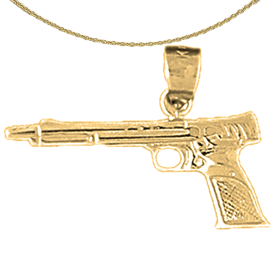 Dies ist ein eleganter Anhänger in Form einer Pistole aus 14- oder 18-karätigem Gold. Dieser Anhänger aus 14- oder 18-karätigem Gold ist 15 mm lang und 23 mm breit. Die Maße umfassen den Ring. JewelsObsession fertigt sämtlichen Goldschmuck in unserer hochmodernen Produktionsstätte.