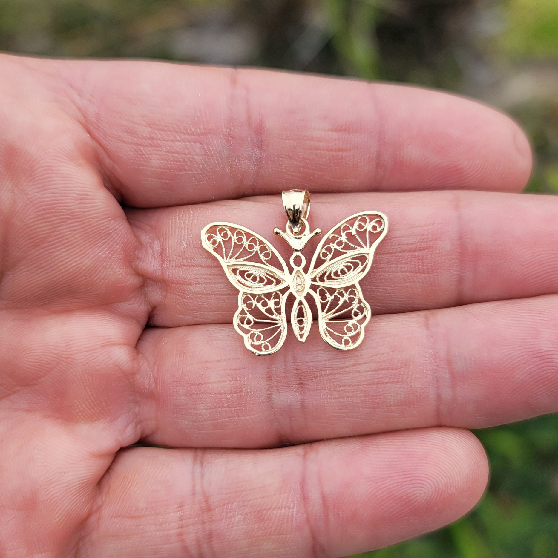 Este es un hermoso colgante de mariposa de oro de 10K, 14K o 18K. Este colgante de oro de 10 quilates, 14 quilates o 18 quilates mide 26 mm de largo por 29 mm de ancho. La medida incluye fardo. JewelsObsession crea todas las joyas de oro en nuestras instalaciones de fabricación de última generación.