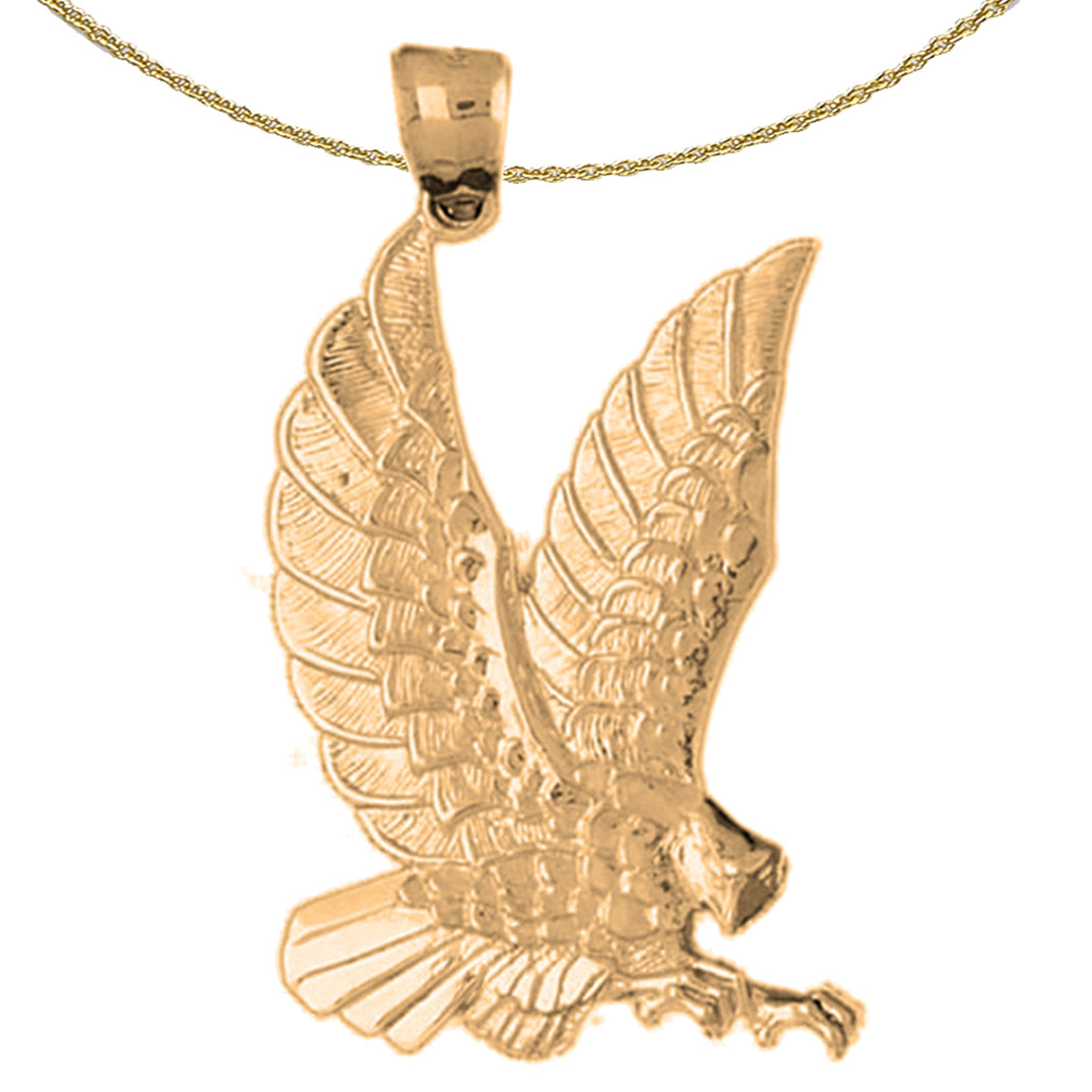 Este es un elegante colgante de águila de oro de 10K, 14K o 18K. Este colgante de oro de 10 quilates, 14 quilates o 18 quilates mide 53 mm de largo por 19 mm de ancho. La medida incluye fardo. JewelsObsession crea todas las joyas de oro en nuestras instalaciones de fabricación de última generación.