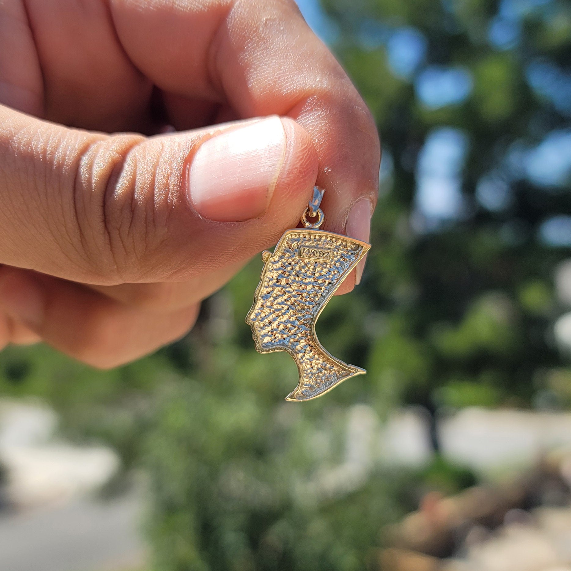 Este es un hermoso colgante Nefertiti de oro de 10K, 14K o 18K. Este colgante de oro de 10 quilates, 14 quilates o 18 quilates mide 31 mm de largo por 18 mm de ancho. La medida incluye fardo. JewelsObsession crea todas las joyas de oro en nuestras instalaciones de fabricación de última generación.