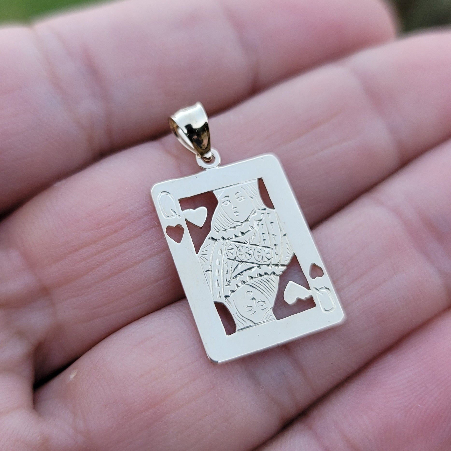 Este es un hermoso colgante de reina de corazones de naipes de oro de 10K, 14K o 18K. Este colgante de oro de 10K, 14K o 18K mide de largo por ancho. La medida incluye fardo. JewelsObsession crea todas las joyas de oro en nuestras instalaciones de fabricación de última generación.