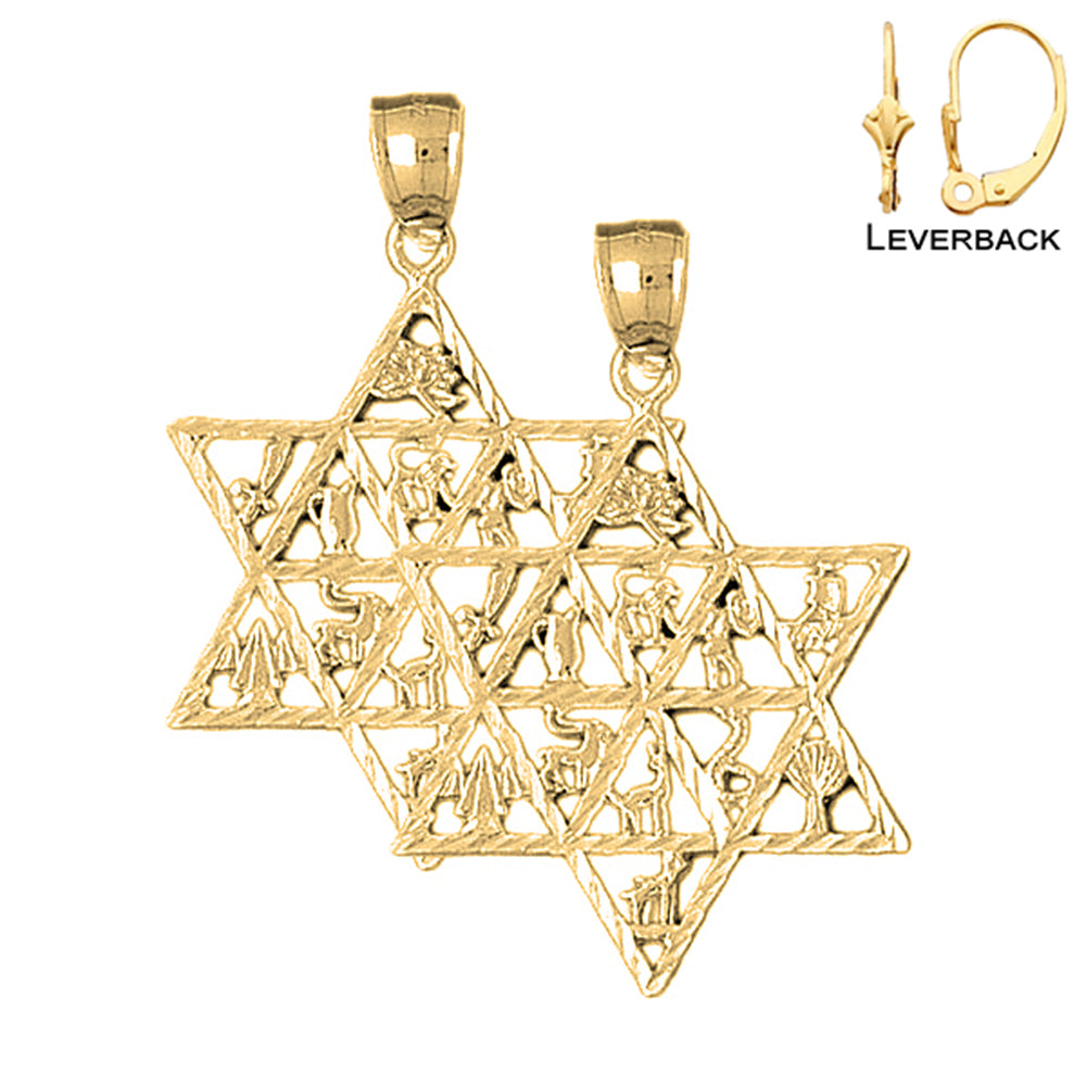 Con unas dimensiones de 43 mm de largo y 29 mm de ancho, estos aretes están diseñados para llamar la atención y generar conversaciones. El intrincado dije de la Estrella de David cuelga con gracia, mostrando sus intrincados detalles y añadiendo un toque de sofisticación a cualquier conjunto.
