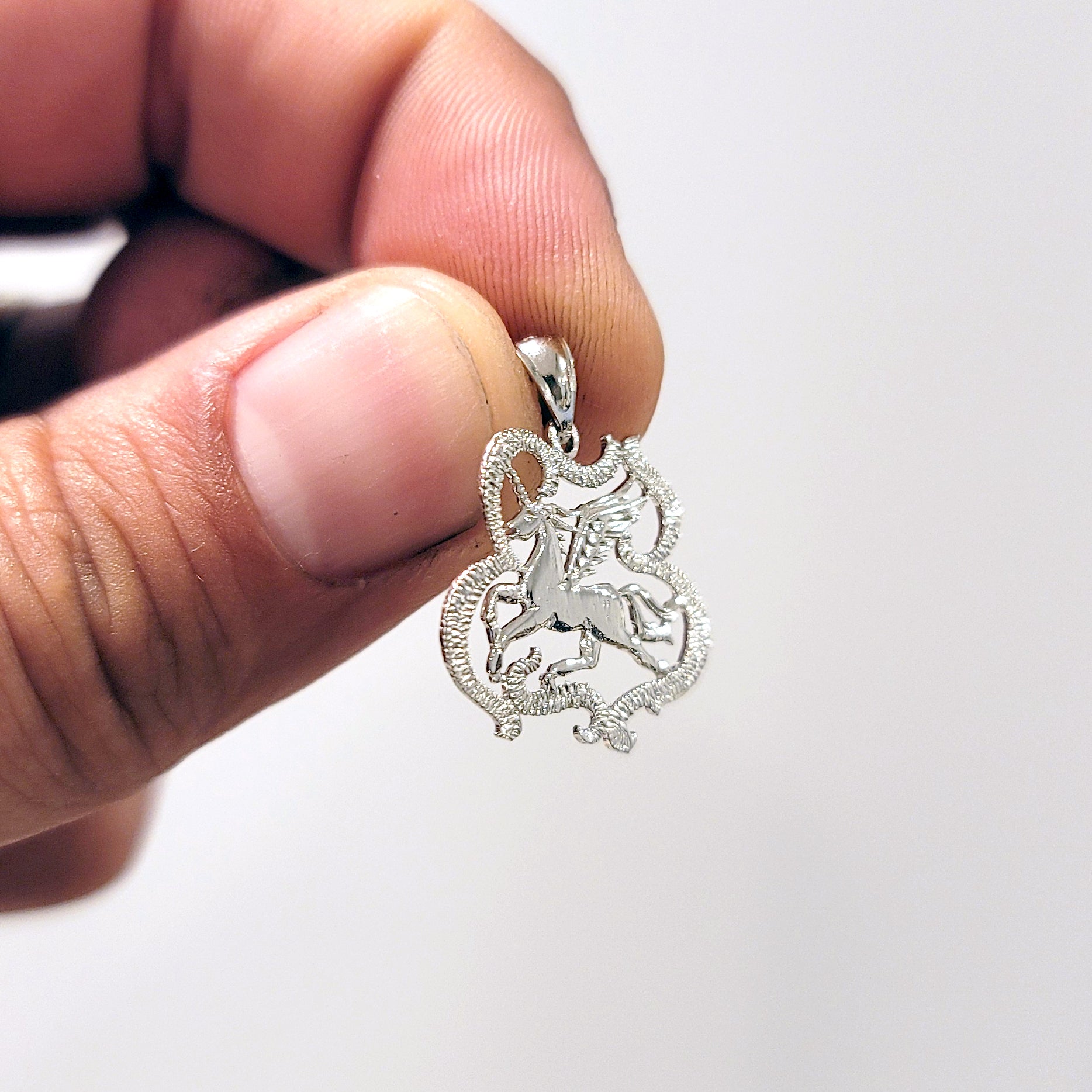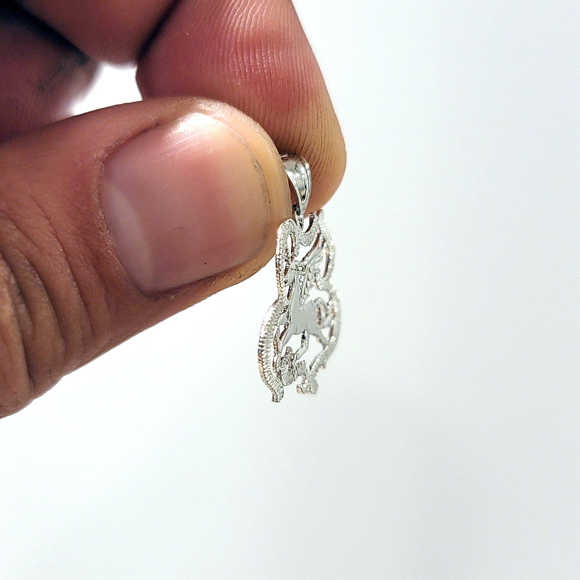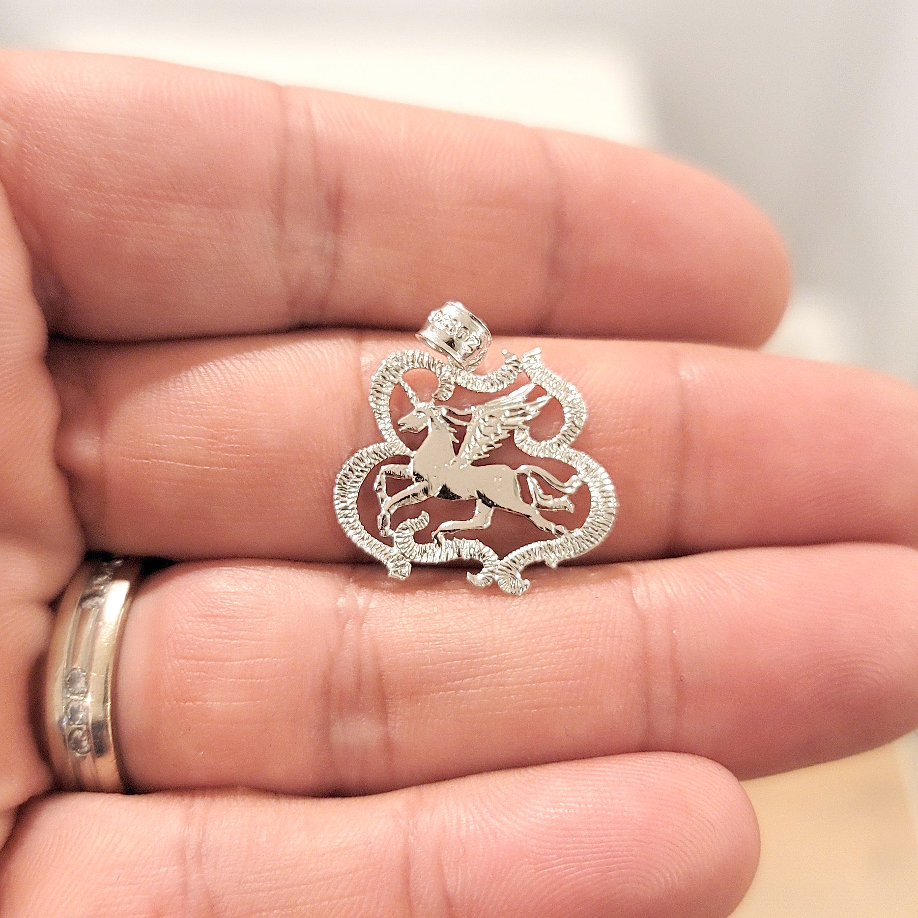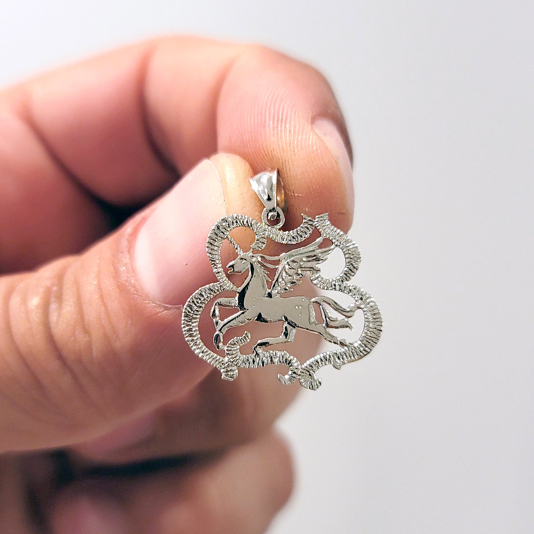 Este elegante colgante de pegaso de plata de ley 925. Este colgante de plata de ley mide 22 mm de largo por 22 mm de ancho. La medida incluye fardo. Espere entre 7 y 10 días hábiles para que se envíe el artículo.