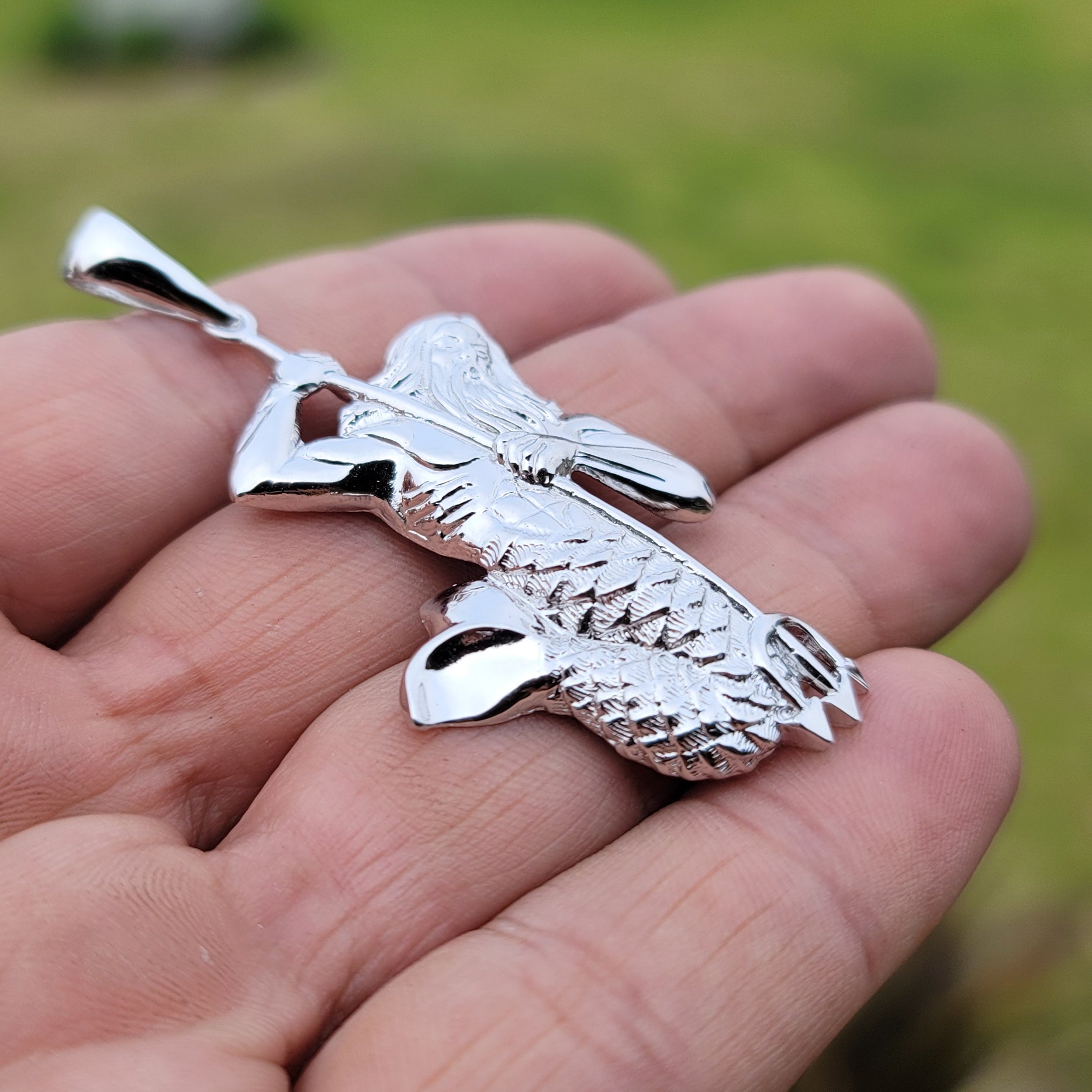 Este elegante colgante de Poseidón de plata de ley 925. Este colgante de plata de ley mide 64 mm de largo por 32 mm de ancho. La medida incluye fardo. Espere entre 7 y 10 días hábiles para que se envíe el artículo.
