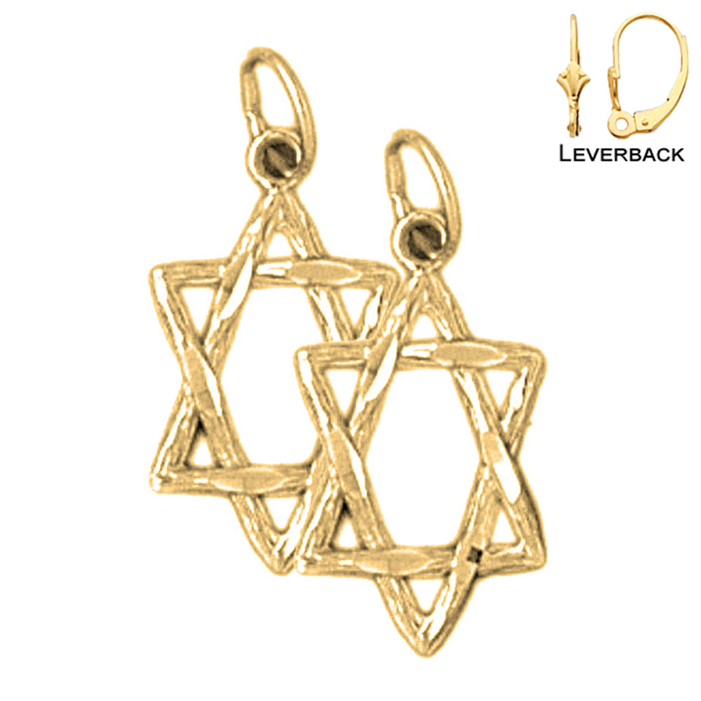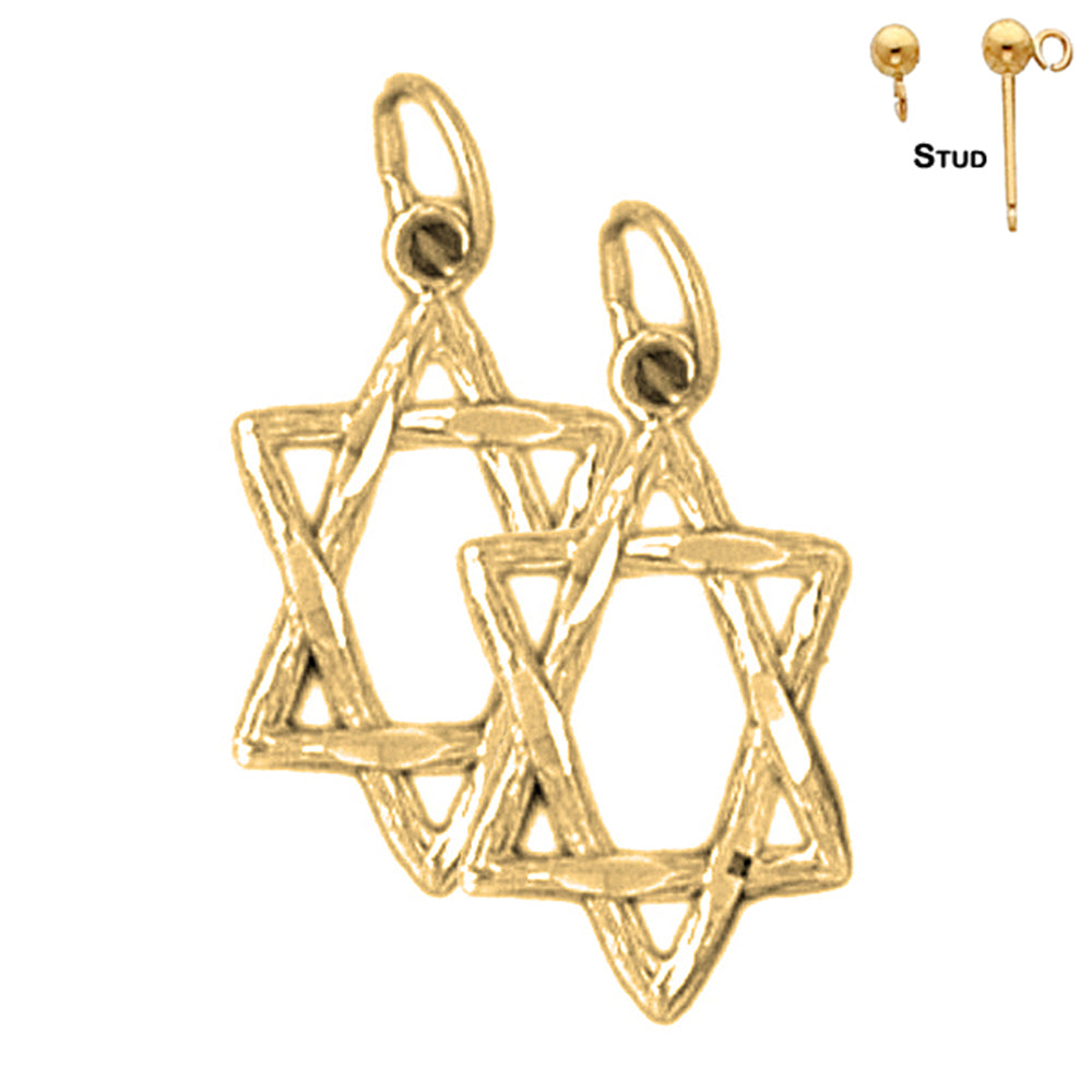 This is an elegant 14k yellow gold 21mm star of david earrings. This 14k yellow gold earrings measures 21 mm in length by 10 mm width. JewelsObsession creates all gold jewelry in our state of the art manufacturing facility.