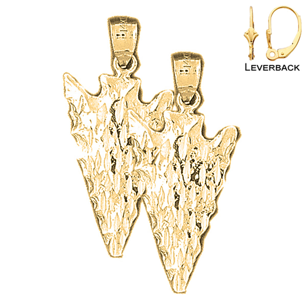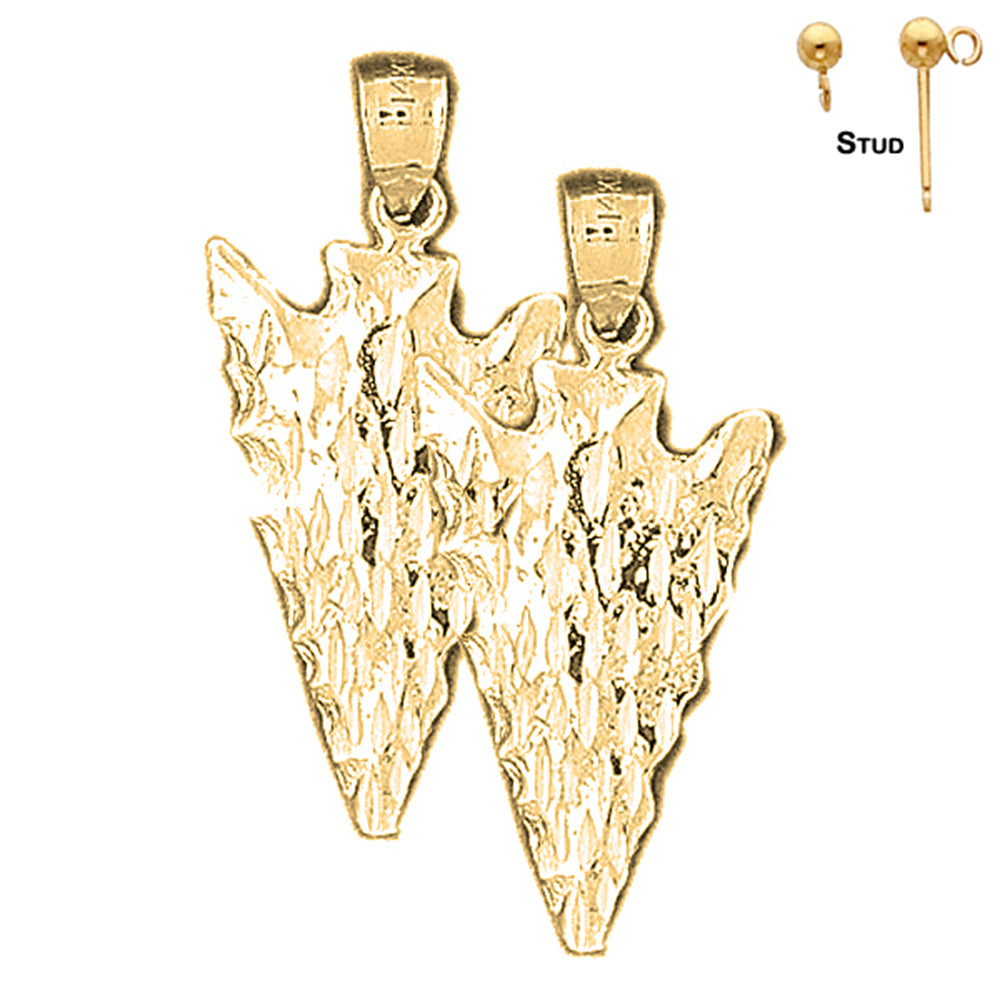This is a gorgeous 14k yellow gold 32mm arrowhead earrings. This 14k yellow gold earrings measures 32 mm in length by 15 mm width. JewelsObsession creates all gold jewelry in our state of the art manufacturing facility.