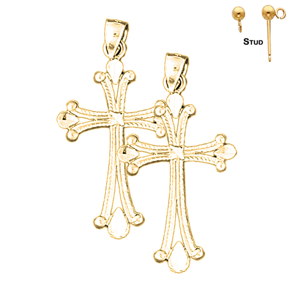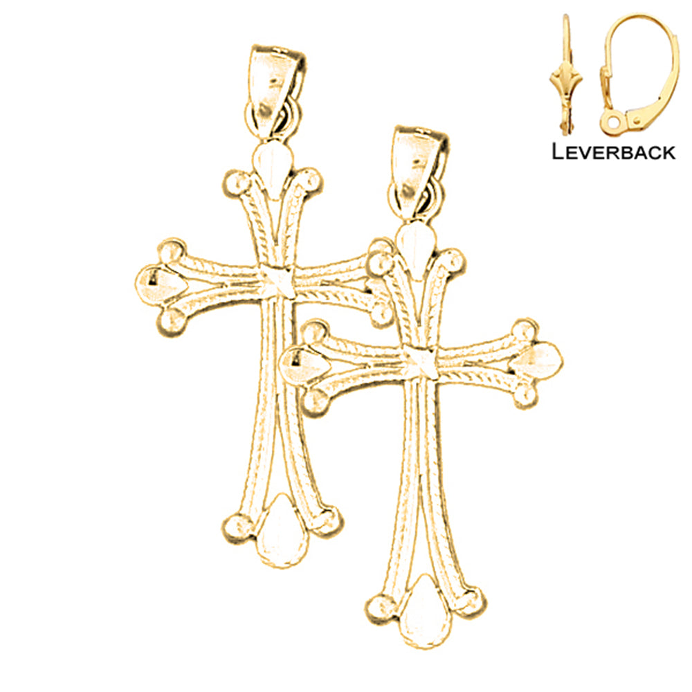 This is a beautiful 14k yellow gold 37mm budded cross earrings. This 14k yellow gold earrings measures 37 mm in length by 21 mm width. JewelsObsession creates all gold jewelry in our state of the art manufacturing facility.