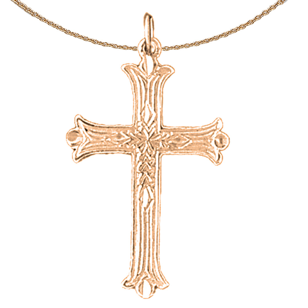 This is an elegant 14K or 18K gold cross pendant. This 14K or 18K gold pendant measures 34 mm in length by 19 mm in width. Measurement includes bale. JewelsObsession creates all gold jewelry in our state of the art manufacturing facility.