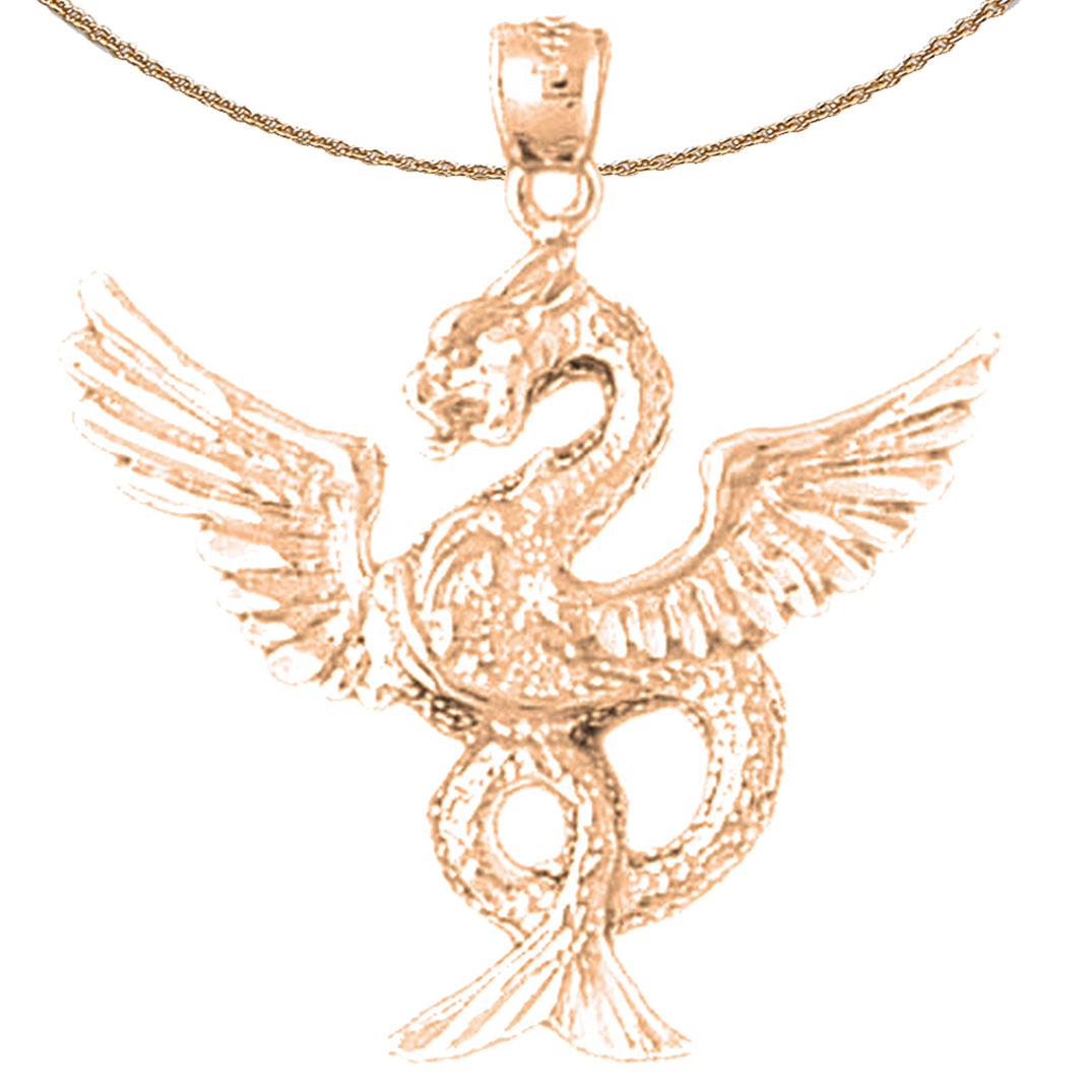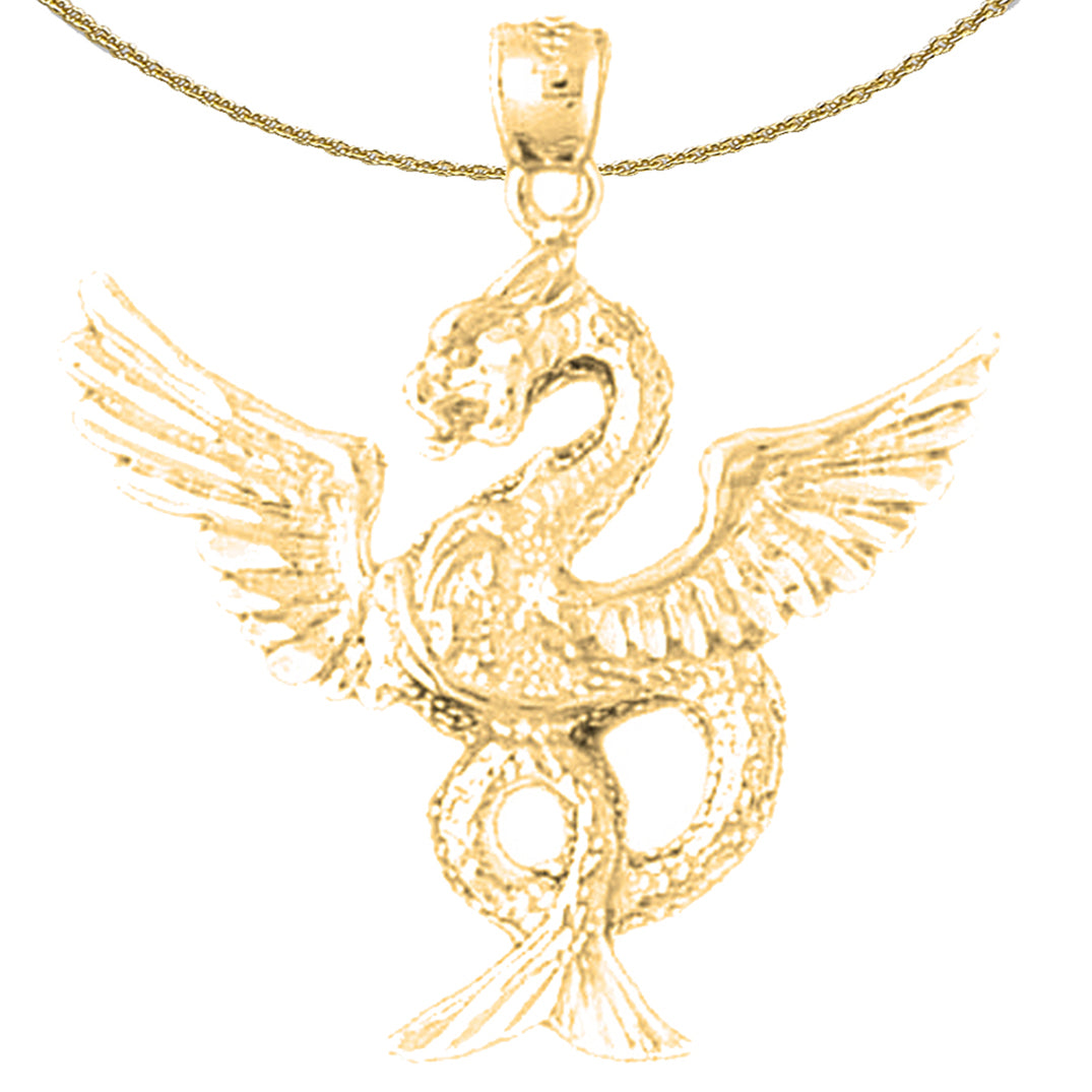 This is an elegant 10K, 14K or 18K gold dragon pendant. This 10K, 14K or 18K gold pendant measures 33 mm in length by 30 mm in width. Measurement includes bale. JewelsObsession creates all gold jewelry in our state of the art manufacturing facility.