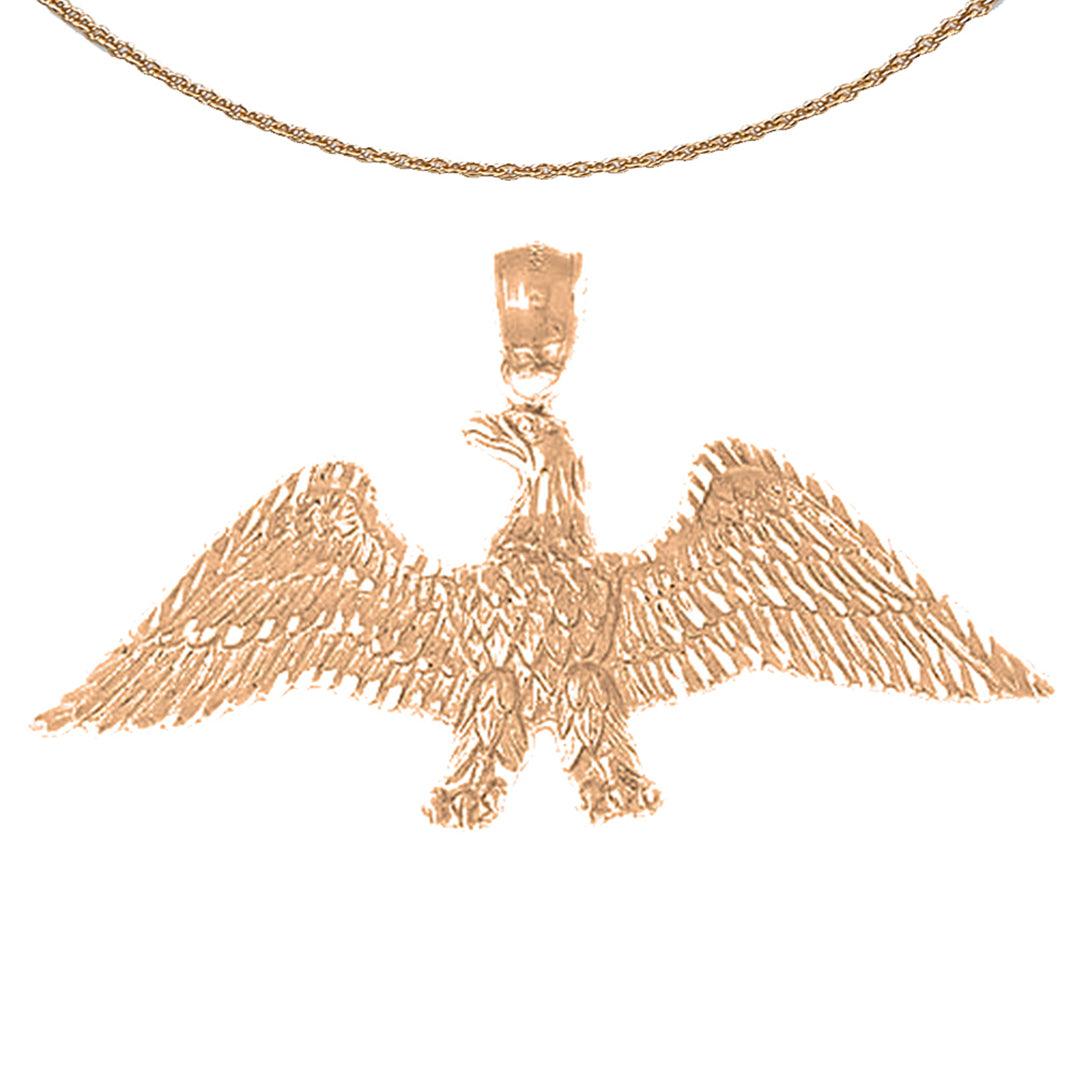 This is an elegant 10K, 14K or 18K gold eagle pendant. This 10K, 14K or 18K gold pendant measures 32 mm in length by 56 mm in width. Measurement includes bale. JewelsObsession creates all gold jewelry in our state of the art manufacturing facility.