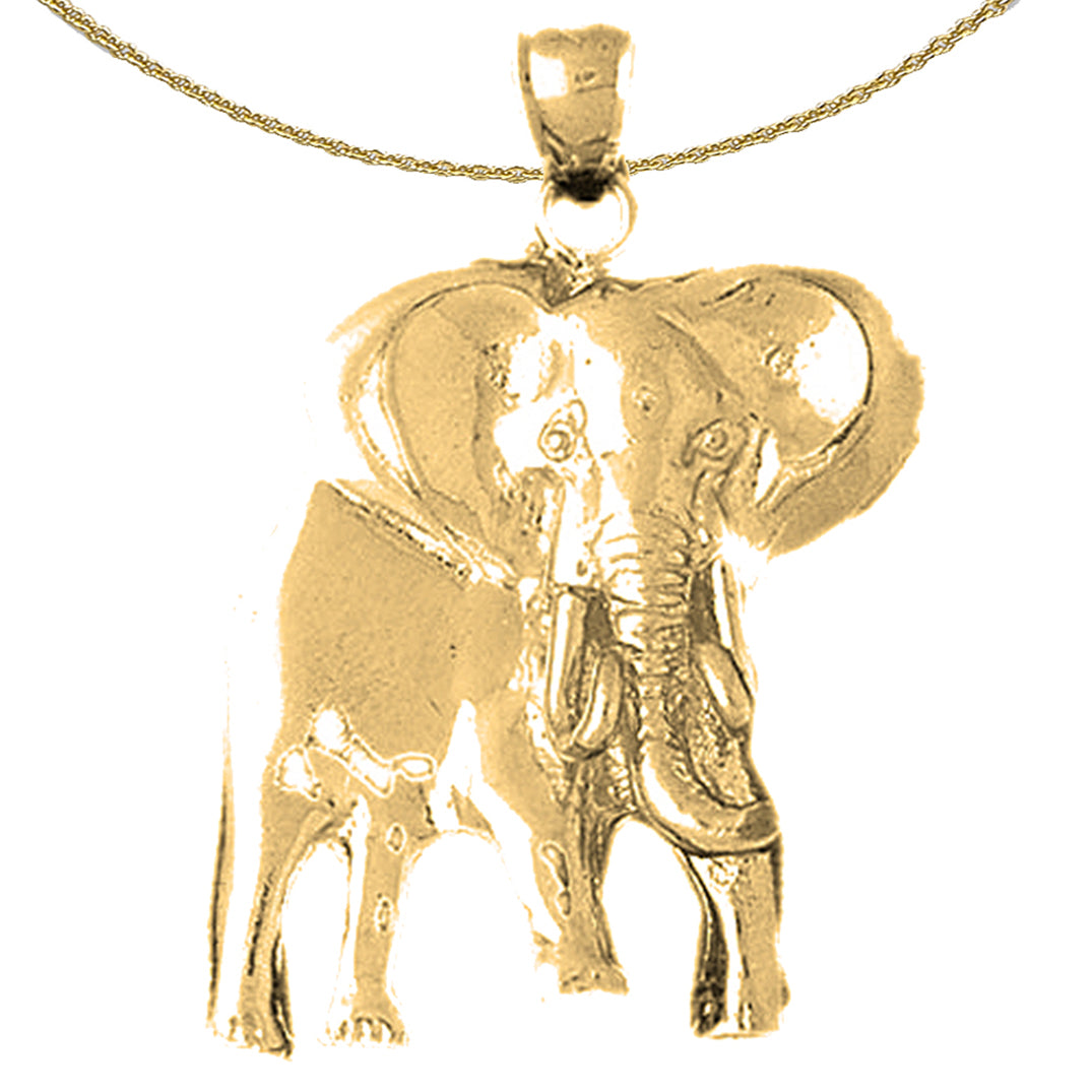 This is an elegant 10K, 14K or 18K gold elephant pendant. This 10K, 14K or 18K gold pendant measures 36 mm in length by 25 mm in width. Measurement includes bale. JewelsObsession creates all gold jewelry in our state of the art manufacturing facility.