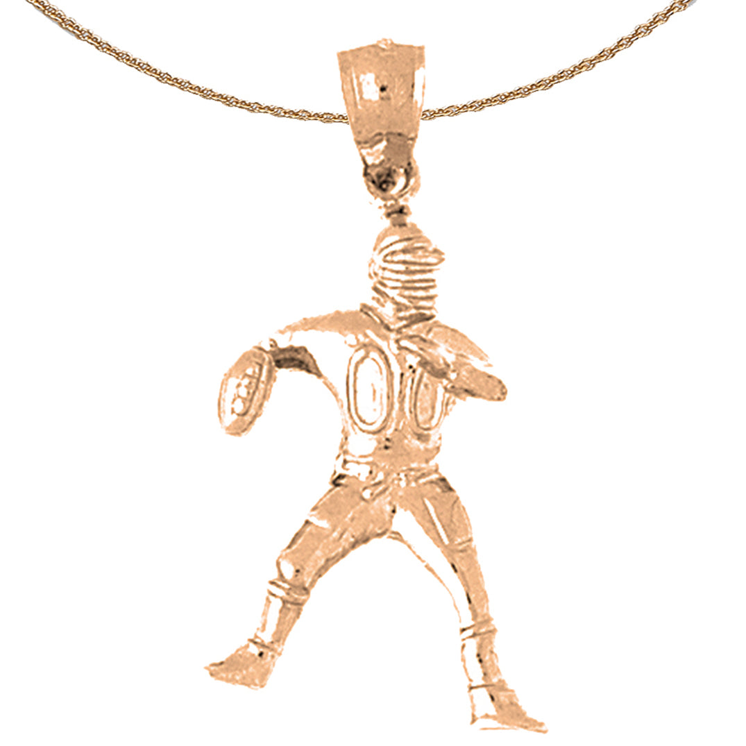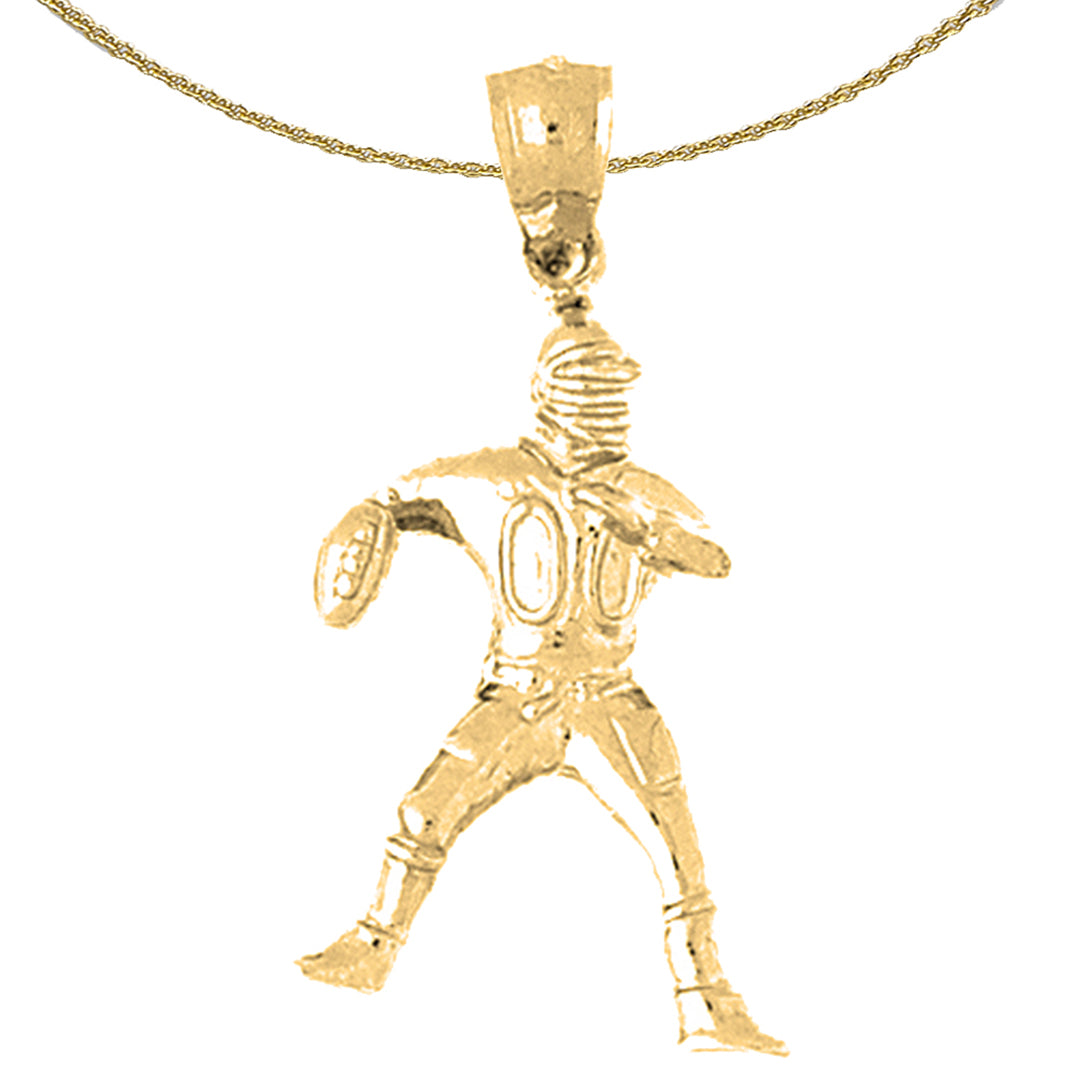 This is a beautiful 10K, 14K or 18K gold football player pendant. This 10K, 14K or 18K gold pendant measures 38 mm in length by 20 mm in width. Measurement includes bale. JewelsObsession creates all gold jewelry in our state of the art manufacturing facility.