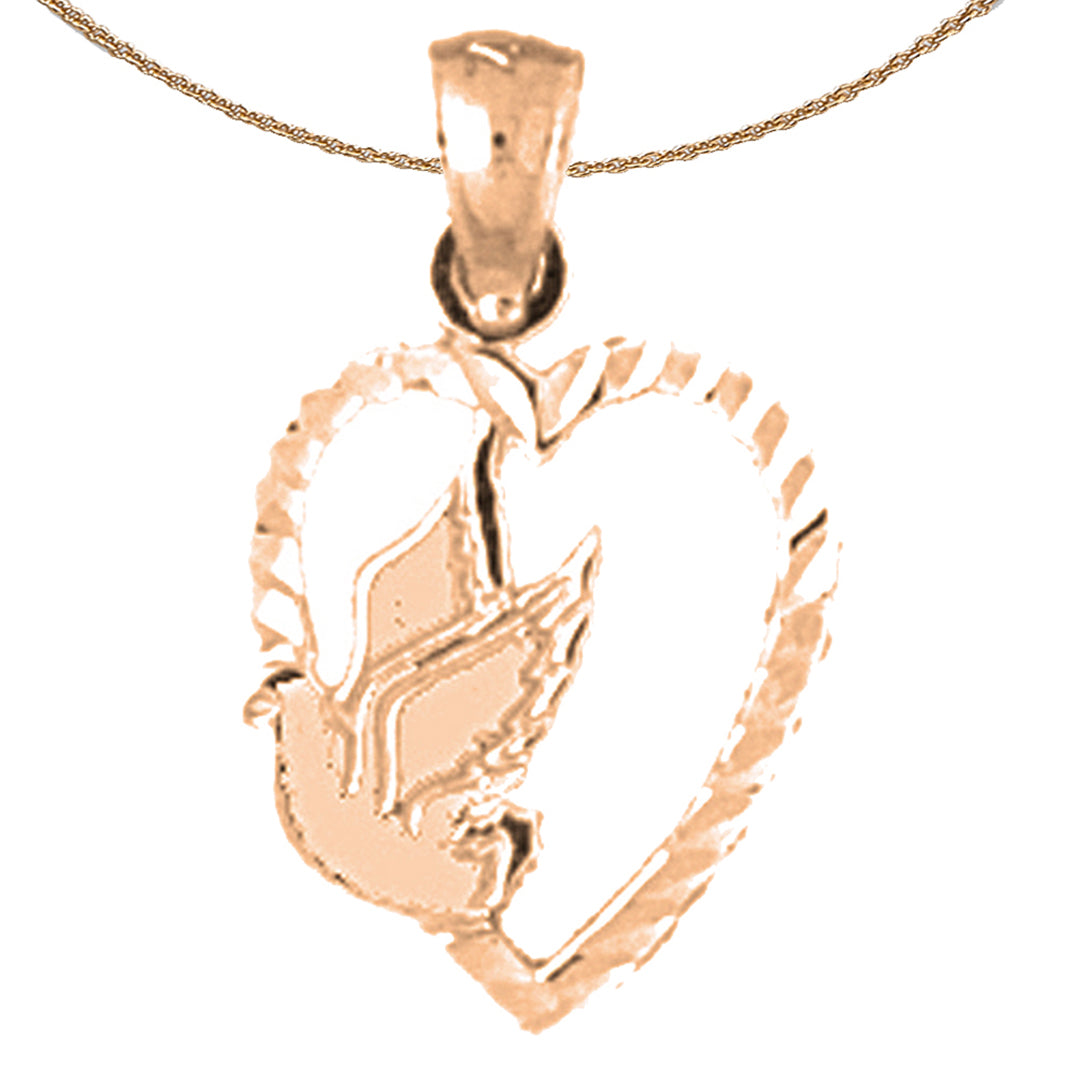 This is a stunning 14K or 18K gold heart with dove pendant. This 14K or 18K gold pendant measures 20 mm in length by 12 mm in width. Measurement includes bale. JewelsObsession creates all gold jewelry in our state of the art manufacturing facility.