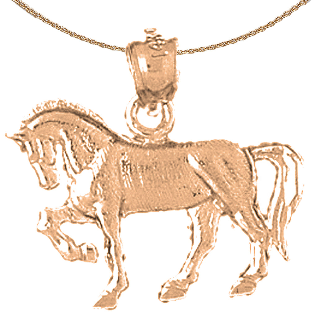 This is an elegant 14K or 18K gold horse pendant. This 14K or 18K gold pendant measures 19 mm in length by 21 mm in width. Measurement includes bale. JewelsObsession creates all gold jewelry in our state of the art manufacturing facility.