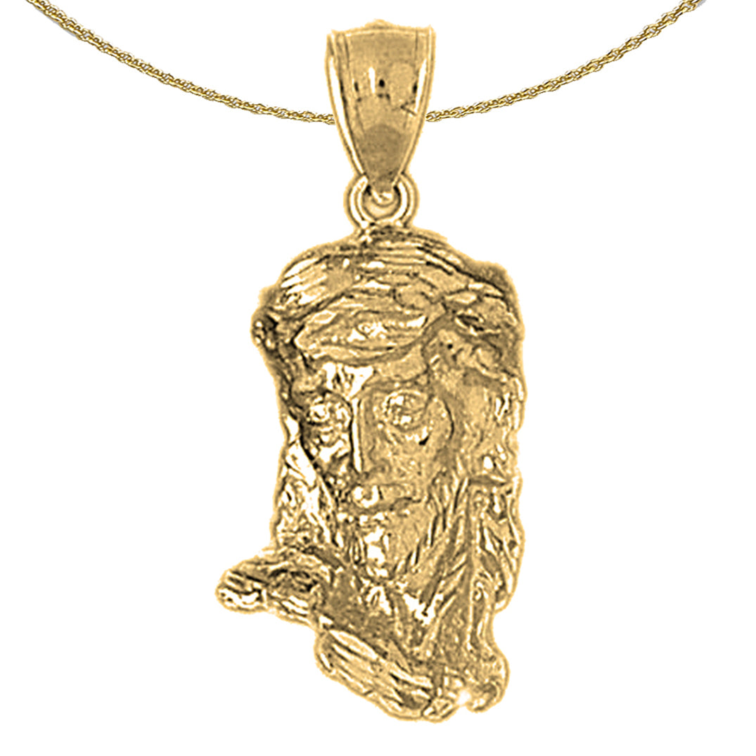 This is a beautiful 10K, 14K or 18K gold jesus pendant. This 10K, 14K or 18K gold pendant measures 35 mm in length by 15 mm in width. Measurement includes bale. JewelsObsession creates all gold jewelry in our state of the art manufacturing facility.