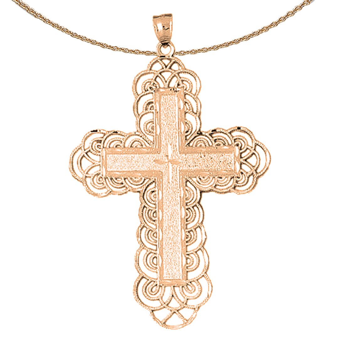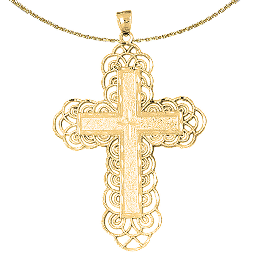 This is a beautiful 10K, 14K or 18K gold cross pendant. This 10K, 14K or 18K gold pendant measures 83 mm in length by 54 mm in width. Measurement includes bale. JewelsObsession creates all gold jewelry in our state of the art manufacturing facility.