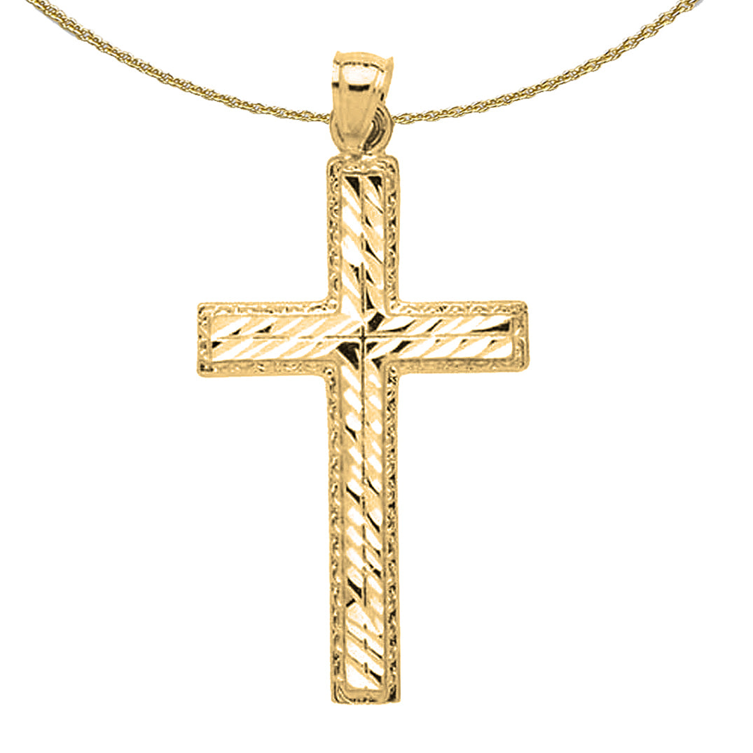 This is a beautiful 10K, 14K or 18K gold cross pendant. This 10K, 14K or 18K gold pendant measures 25 mm in length by 42 mm in width. Measurement includes bale. JewelsObsession creates all gold jewelry in our state of the art manufacturing facility.