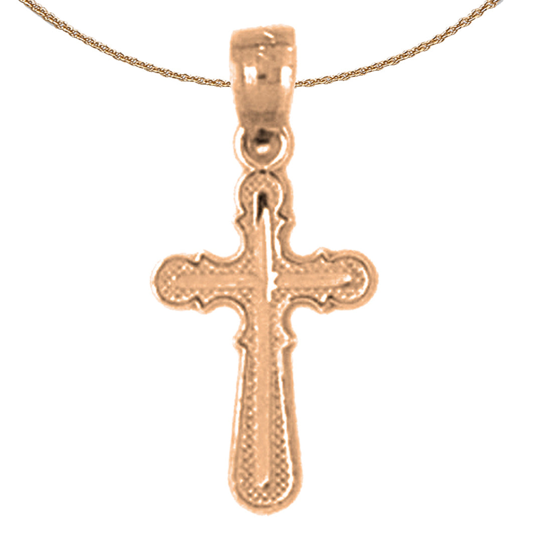 This is an elegant 14K or 18K gold cross pendant. This 14K or 18K gold pendant measures 21 mm in length by 10 mm in width. Measurement includes bale. JewelsObsession creates all gold jewelry in our state of the art manufacturing facility.