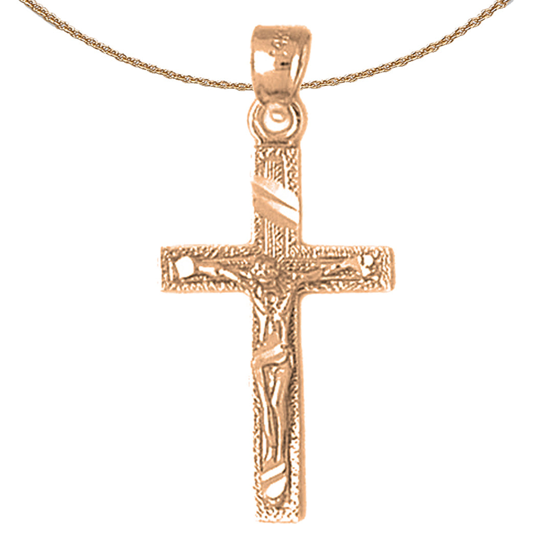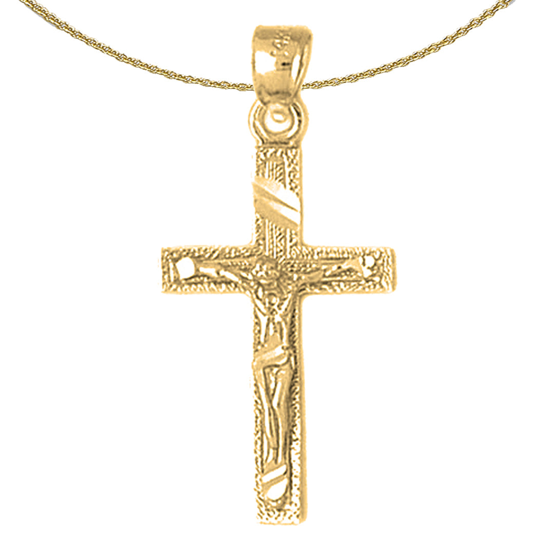 This gorgeous 10K, 14K or 18K gold crucifix pendant. This 10K, 14K or 18K gold pendant measures 33 mm in length by 16 mm in width. Measurement includes bale. JewelsObsession creates all gold jewelry in our state of the art manufacturing facility.