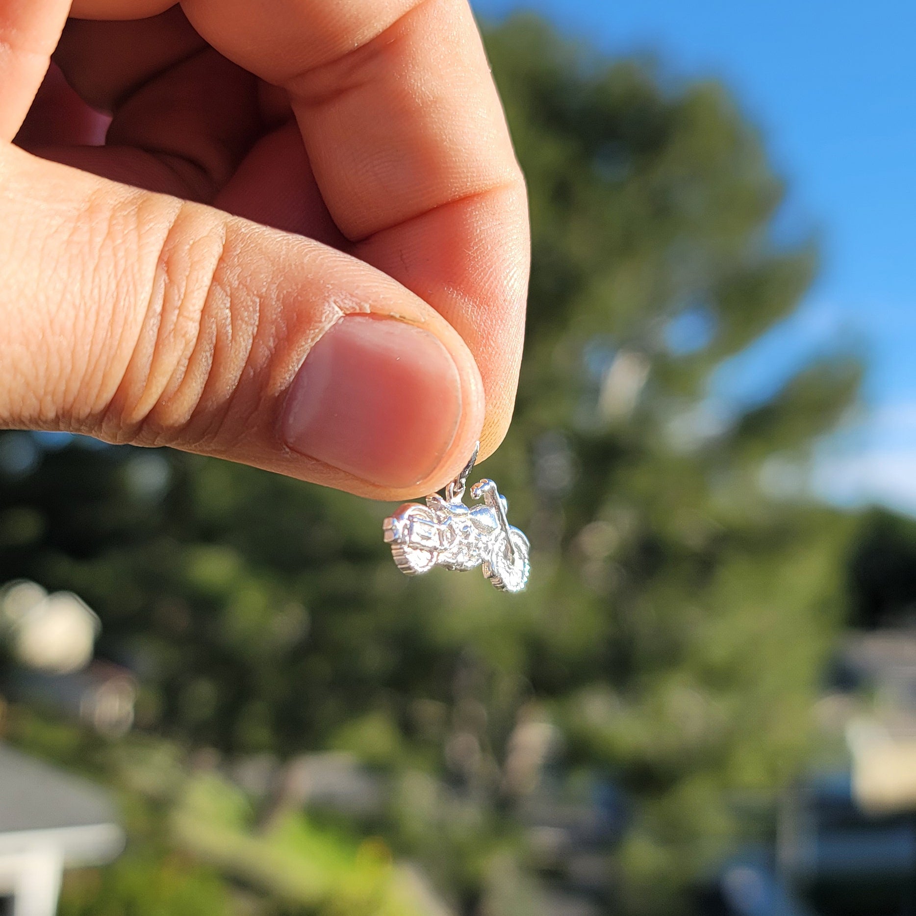 This is an elegant 14K or 18K gold motorcycle pendant. This 14K or 18K gold pendant measures 13 mm in length by 23 mm in width. Measurement includes bale. JewelsObsession creates all gold jewelry in our state of the art manufacturing facility.