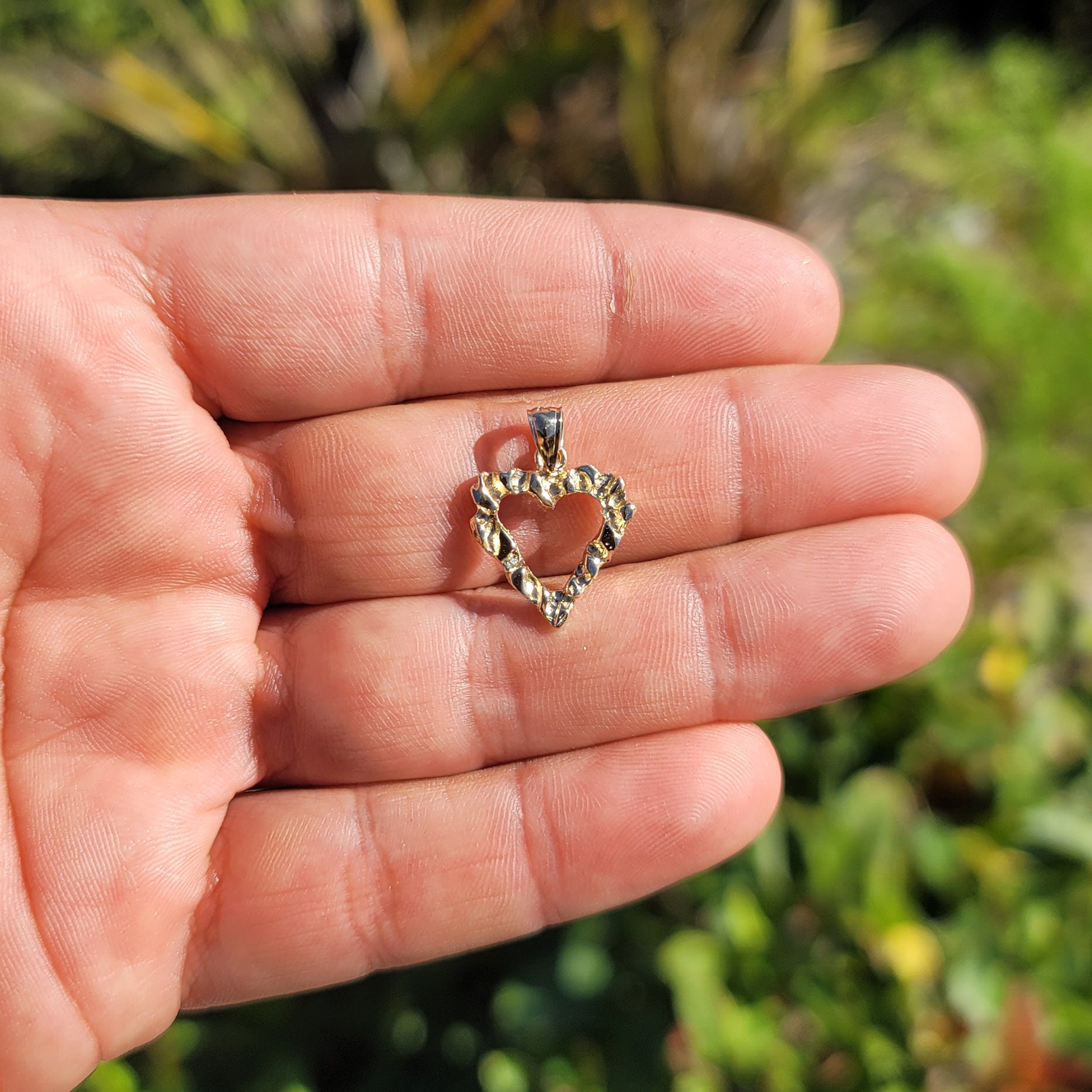 This gorgeous 14K or 18K gold nugget heart pendant. This 14K or 18K gold pendant measures 23 mm in length by 17 mm in width. Measurement includes bale. JewelsObsession creates all gold jewelry in our state of the art manufacturing facility.