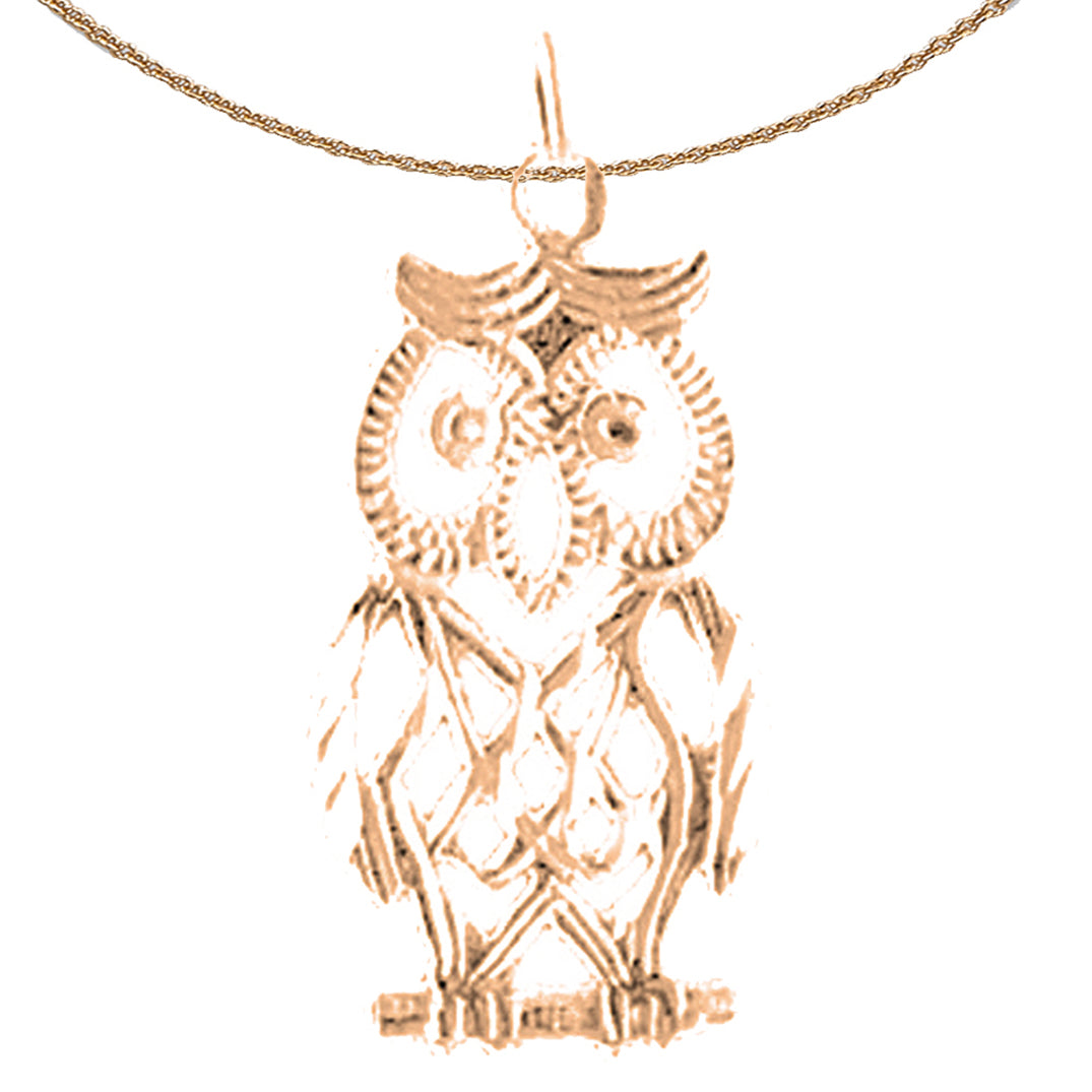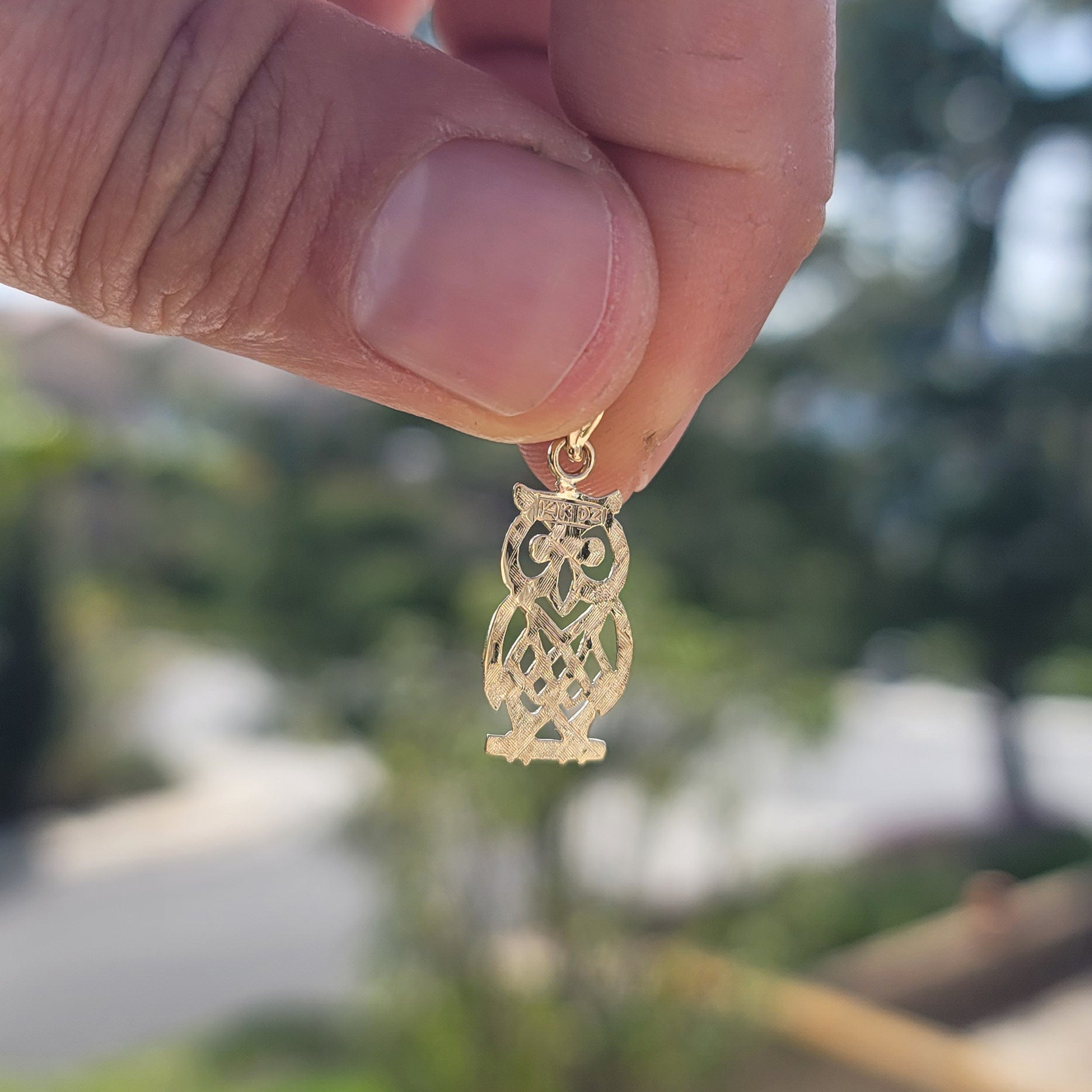 This is a stunning 14K or 18K gold owl pendant. This 14K or 18K gold pendant measures 24 mm in length by 11 mm in width. Measurement includes bale. JewelsObsession creates all gold jewelry in our state of the art manufacturing facility.