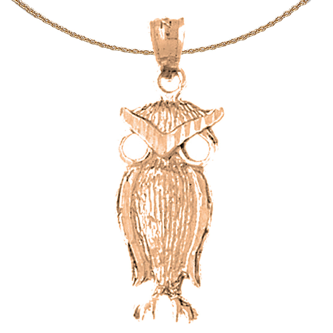 This is a beautiful 14K or 18K gold owl pendant. This 14K or 18K gold pendant measures 30 mm in length by 10 mm in width. Measurement includes bale. JewelsObsession creates all gold jewelry in our state of the art manufacturing facility.