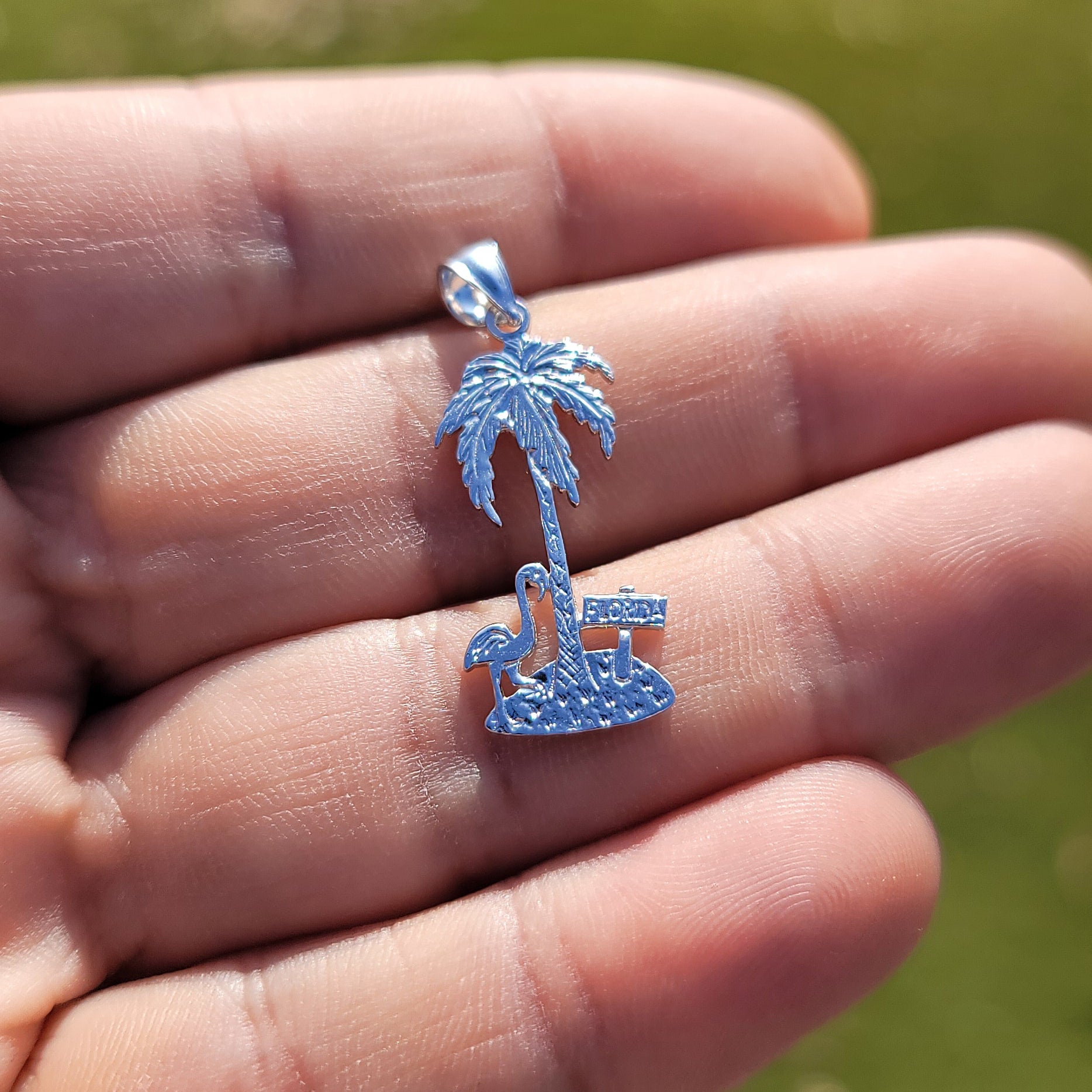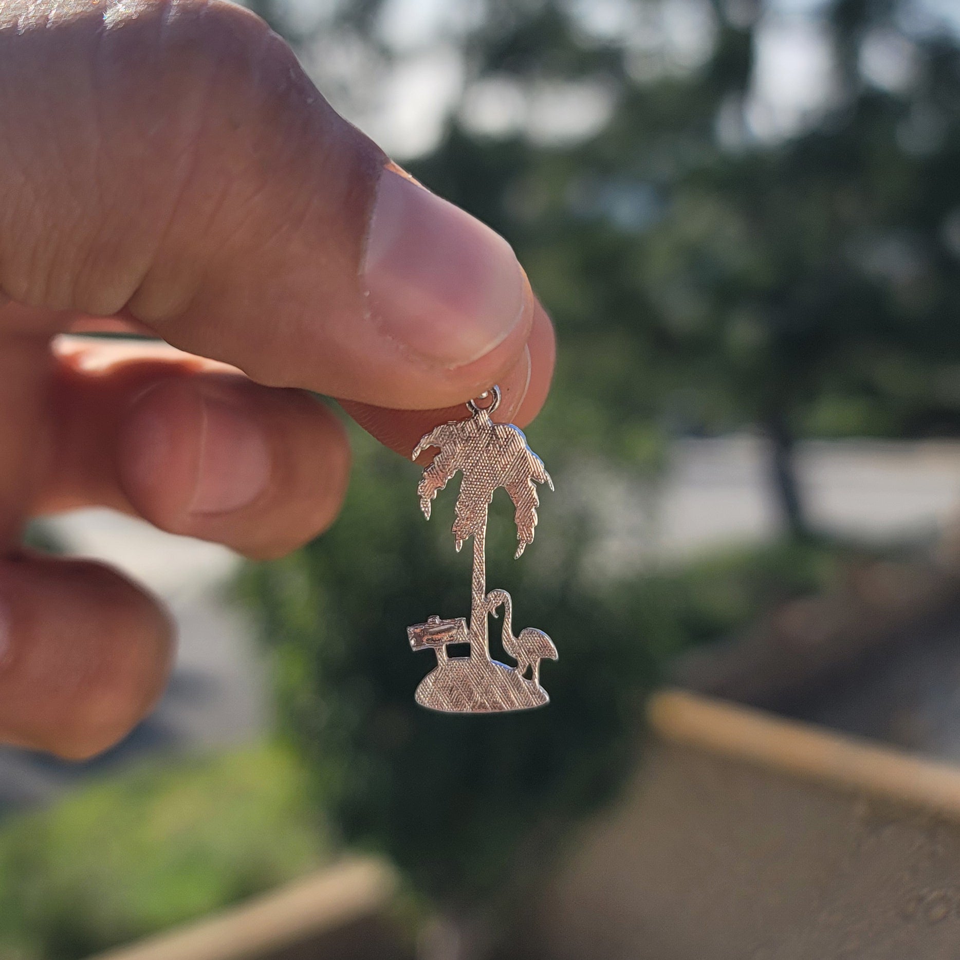 This is a stunning 14K or 18K gold palm tree with flamingo pendant. This 14K or 18K gold pendant measures 34 mm in length by 13 mm in width. Measurement includes bale. JewelsObsession creates all gold jewelry in our state of the art manufacturing facility.