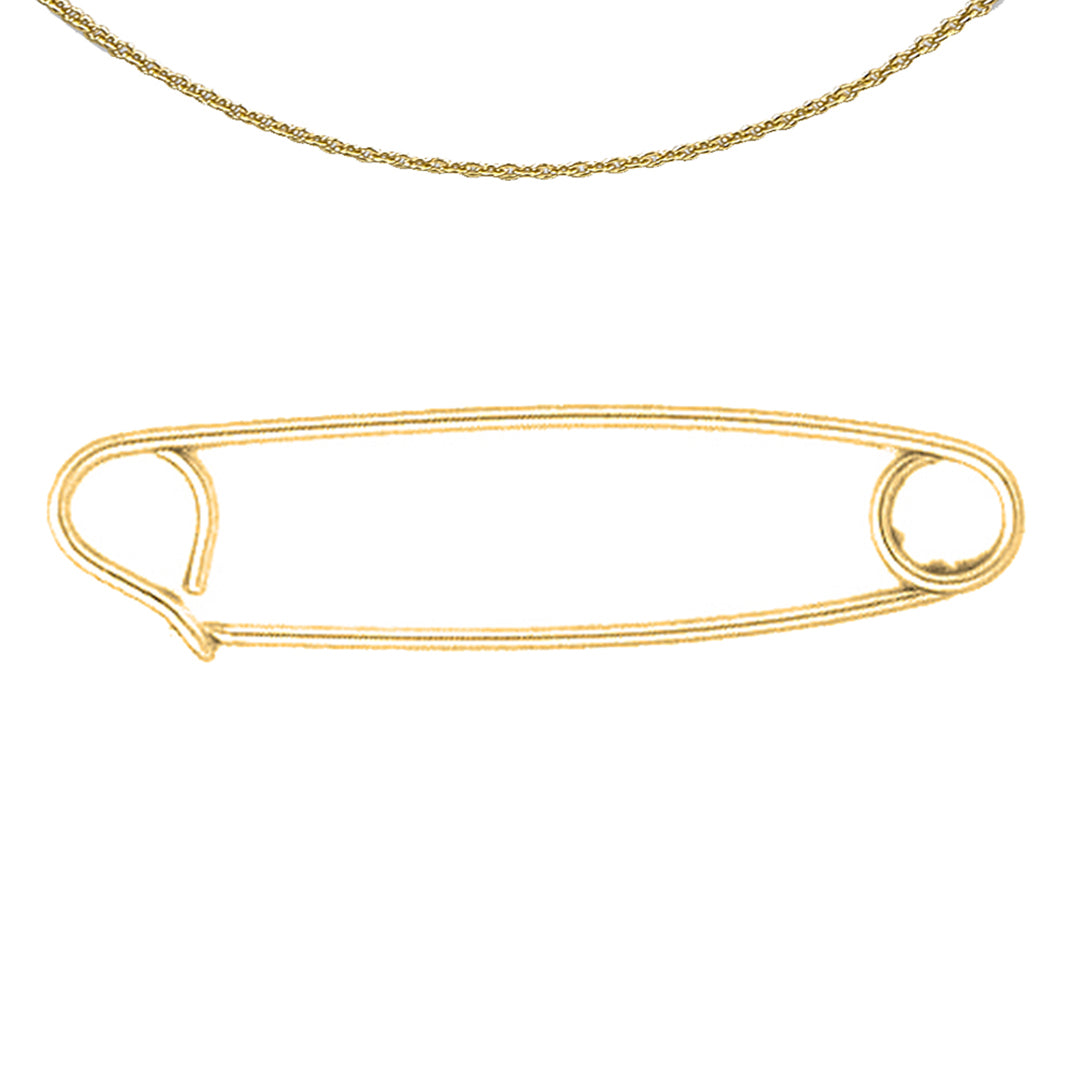This is a beautiful 14K or 18K gold safety pin pendant. This 14K or 18K gold pendant measures 31 mm in length by 24 mm in width. Measurement includes bale. JewelsObsession creates all gold jewelry in our state of the art manufacturing facility.