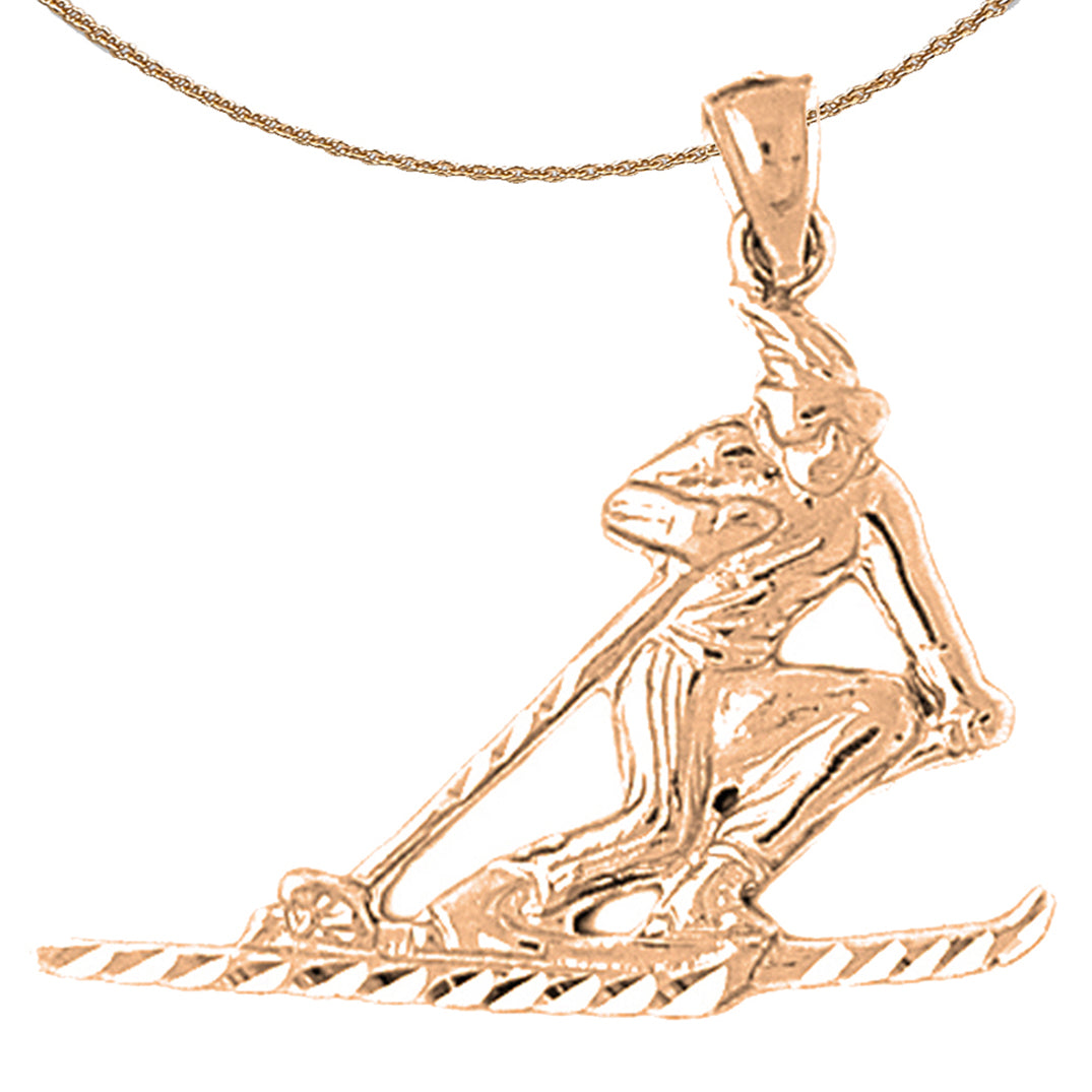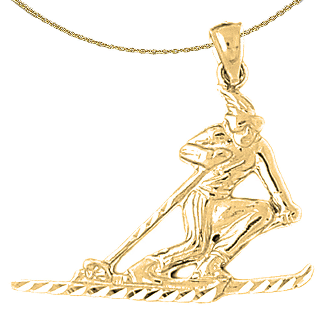 This is a stunning 10K, 14K or 18K gold skier pendant. This 10K, 14K or 18K gold pendant measures 29 mm in length by 31 mm in width. Measurement includes bale. JewelsObsession creates all gold jewelry in our state of the art manufacturing facility.
