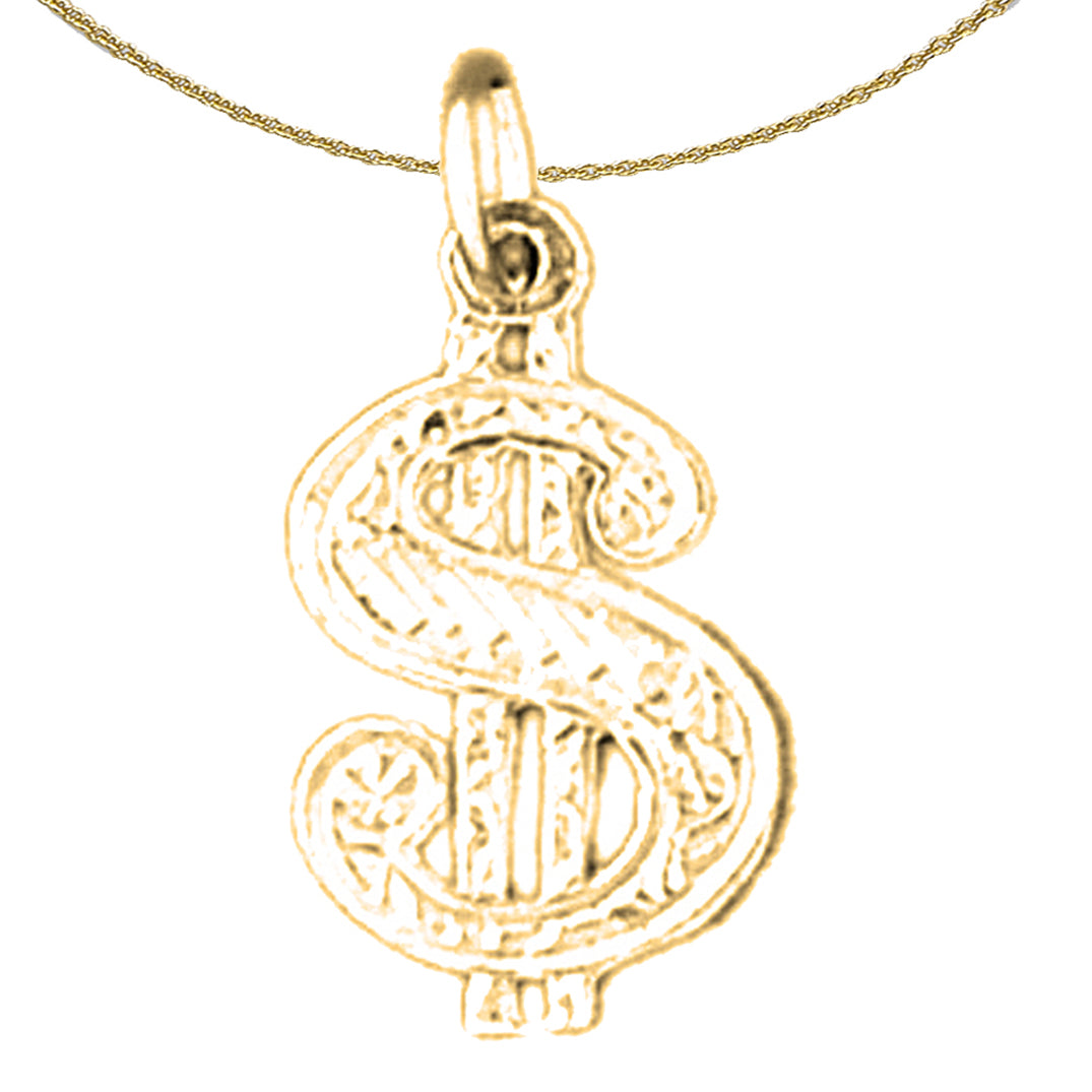 This gorgeous 14K or 18K gold $, money symbol pendant. This 14K or 18K gold pendant measures 21 mm in length by 11 mm in width. Measurement includes bale. JewelsObsession creates all gold jewelry in our state of the art manufacturing facility.