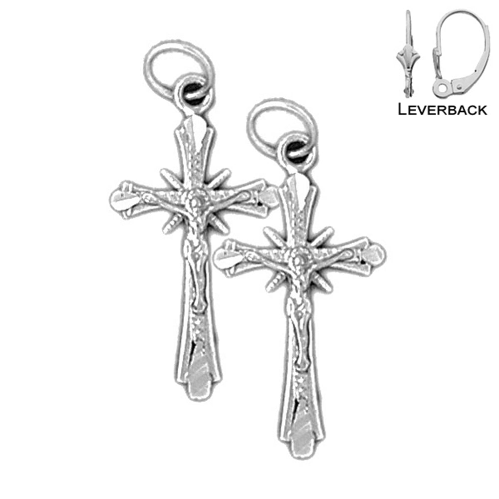 Sterling Silver 26mm Budded Crucifix Earrings (White or Yellow Gold Plated)