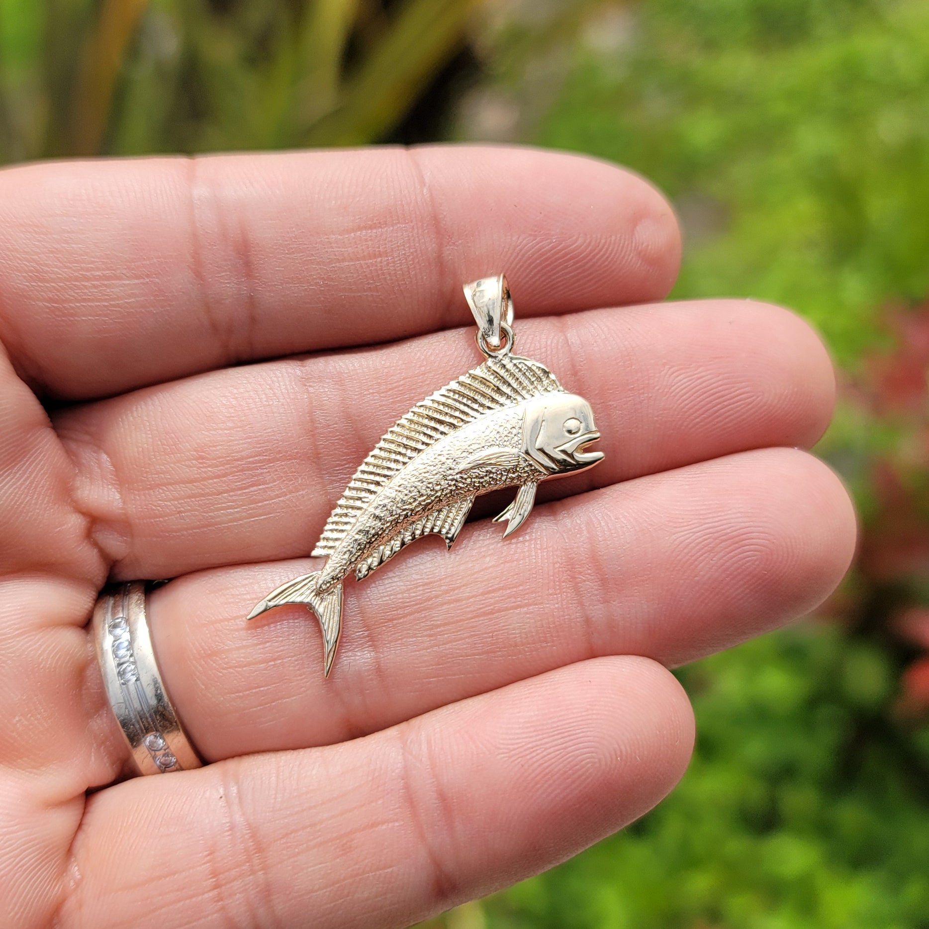 This is a stunning sterling silver 925 mahi mahi pendant. This sterling silver pendant measures 42 mm in length by 34 mm in width. Measurement includes bale. Allow 7-10 bussiness days for item to ship out.