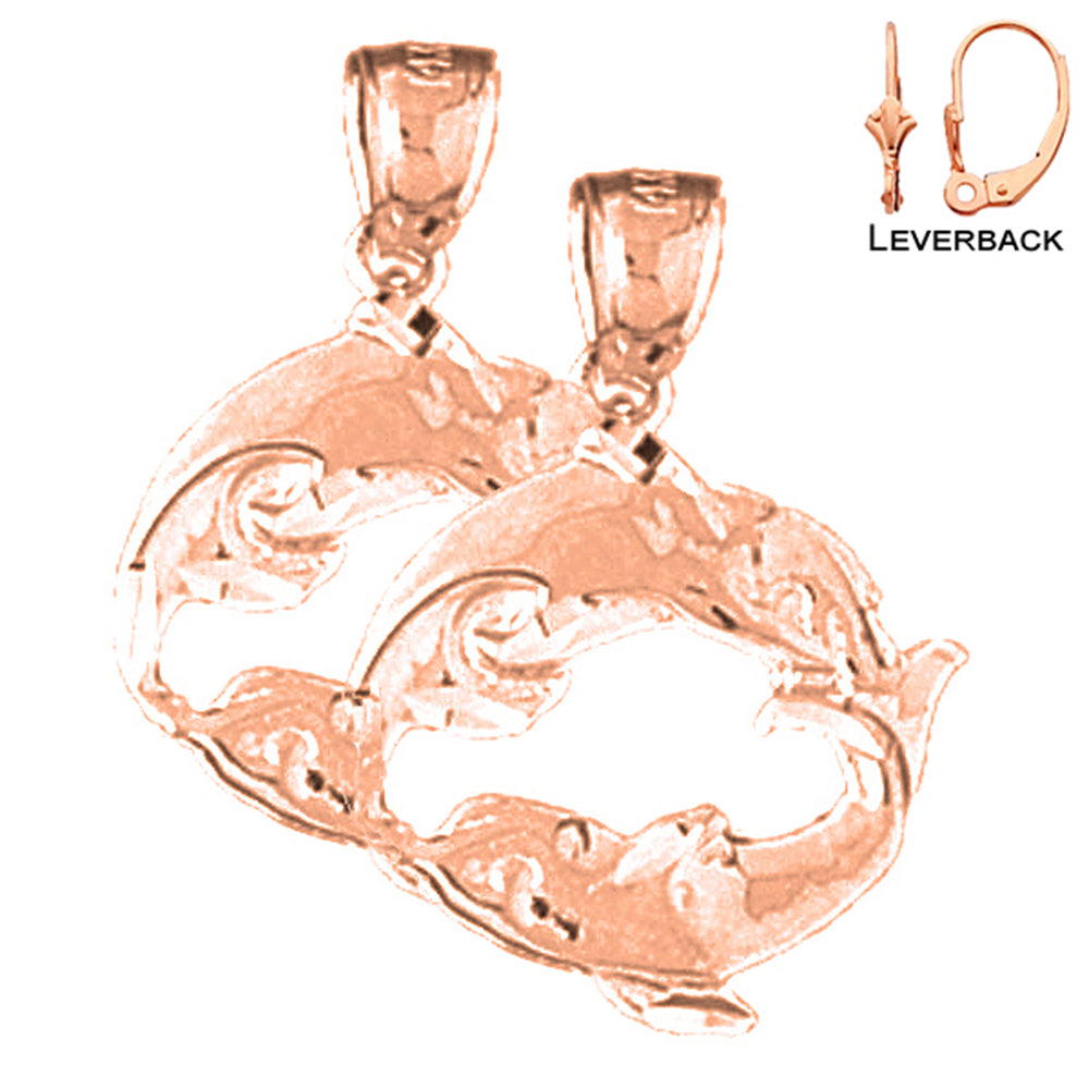 This is an elegant 14k yellow gold 23mm dolphin earrings. This 14k yellow gold earrings measures 23 mm in length by 17 mm width. JewelsObsession creates all gold jewelry in our state of the art manufacturing facility.
