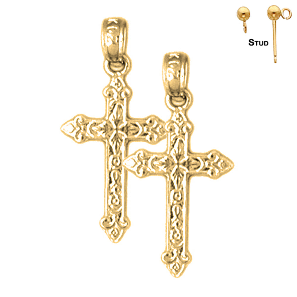 This is an elegant 14k yellow gold 23mm fleur de lis cross earrings. This 14k yellow gold earrings measures 23 mm in length by 12 mm width. JewelsObsession creates all gold jewelry in our state of the art manufacturing facility.