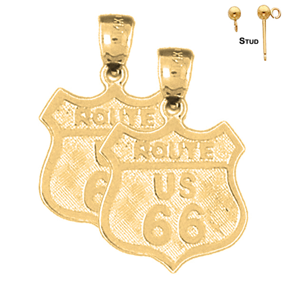 This is a stunning 14k yellow gold 23mm u.s. route 66 earrings. This 14k yellow gold earrings measures 23 mm in length by 16 mm width. JewelsObsession creates all gold jewelry in our state of the art manufacturing facility.