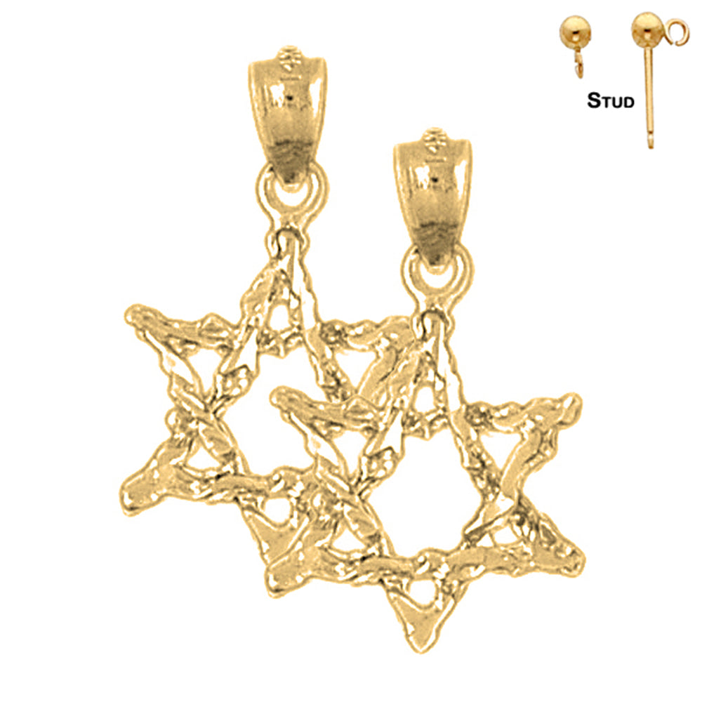 This is an elegant 14k yellow gold 25mm star of david earrings. This 14k yellow gold earrings measures 25 mm in length by 15 mm width. JewelsObsession creates all gold jewelry in our state of the art manufacturing facility.