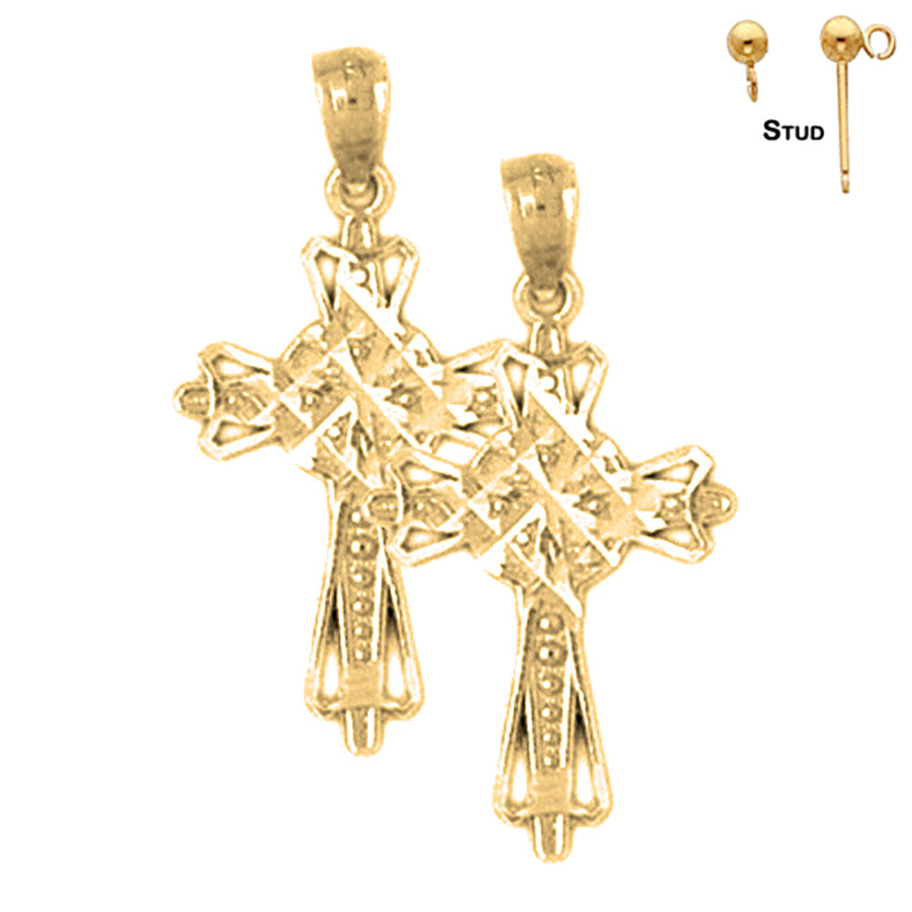 This is a gorgeous 14k yellow gold 26mm cross earrings. This 14k yellow gold earrings measures 26 mm in length by 14 mm width. JewelsObsession creates all gold jewelry in our state of the art manufacturing facility.