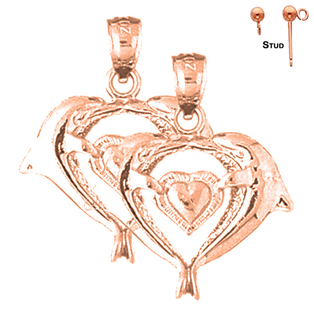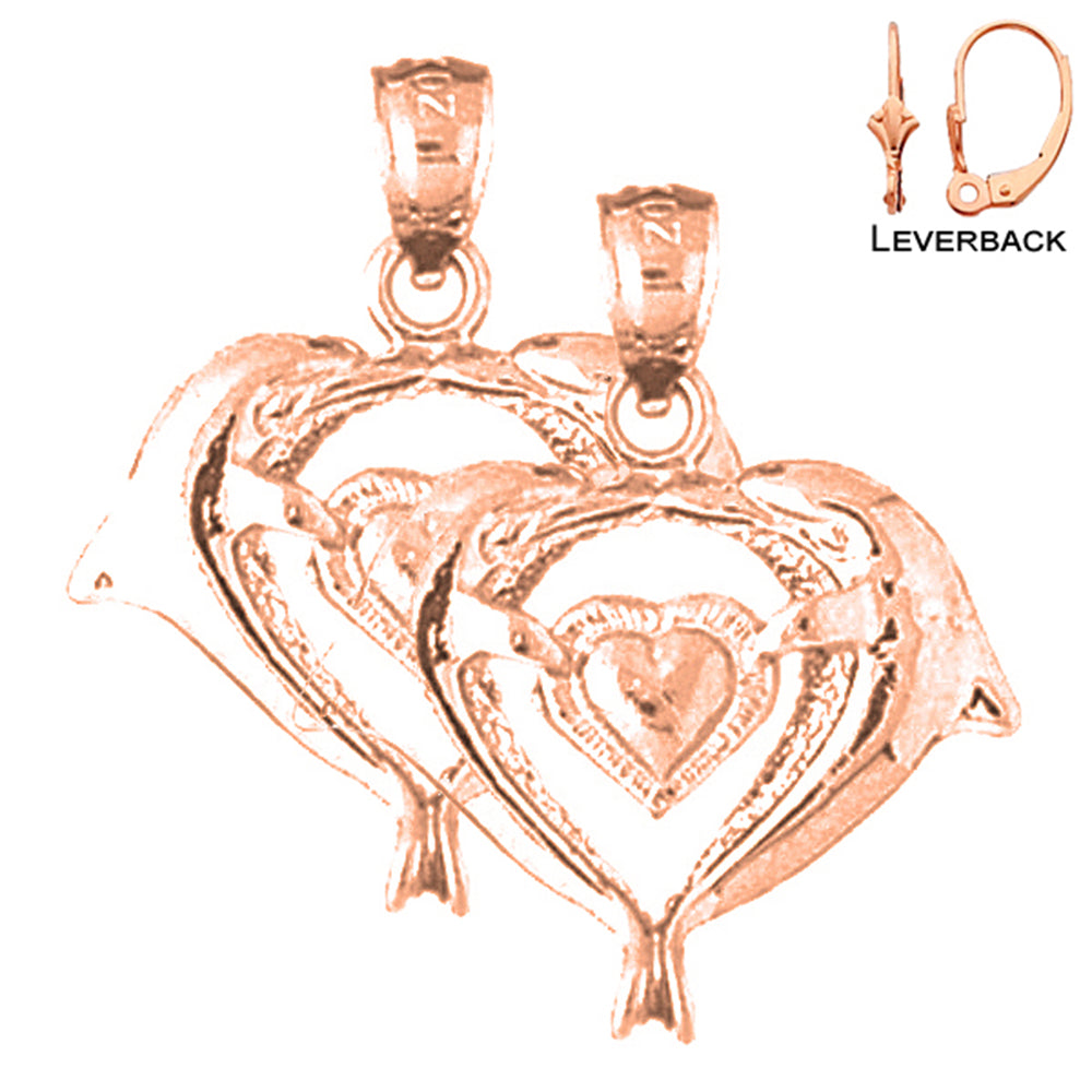14K or 18K Gold 26mm Dolphins With Heart Earrings