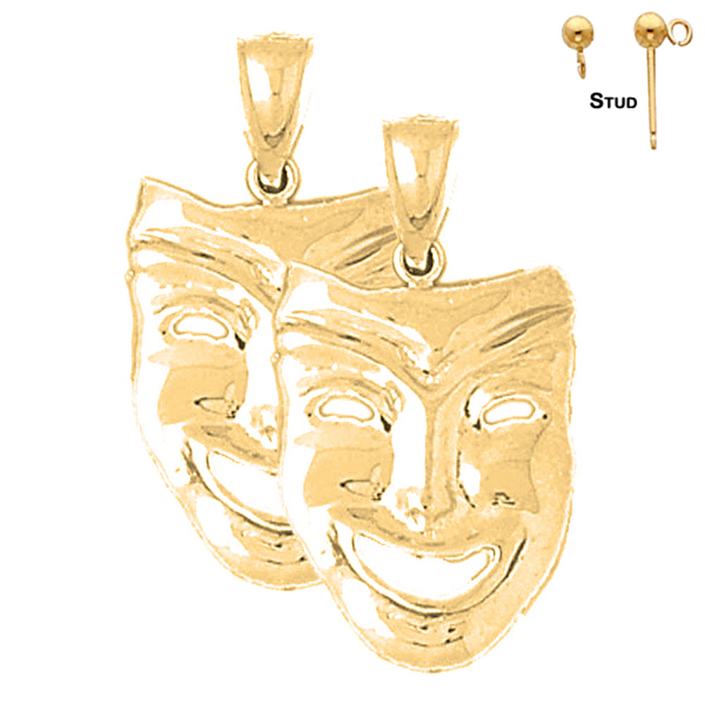 This is an elegant 14k yellow gold 28mm drama mask, laugh now earrings. This 14k yellow gold earrings measures 28 mm in length by 16 mm width. JewelsObsession creates all gold jewelry in our state of the art manufacturing facility.
