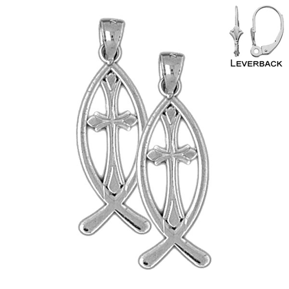 14K or 18K Gold 29mm Christian Fish With Cross Earrings