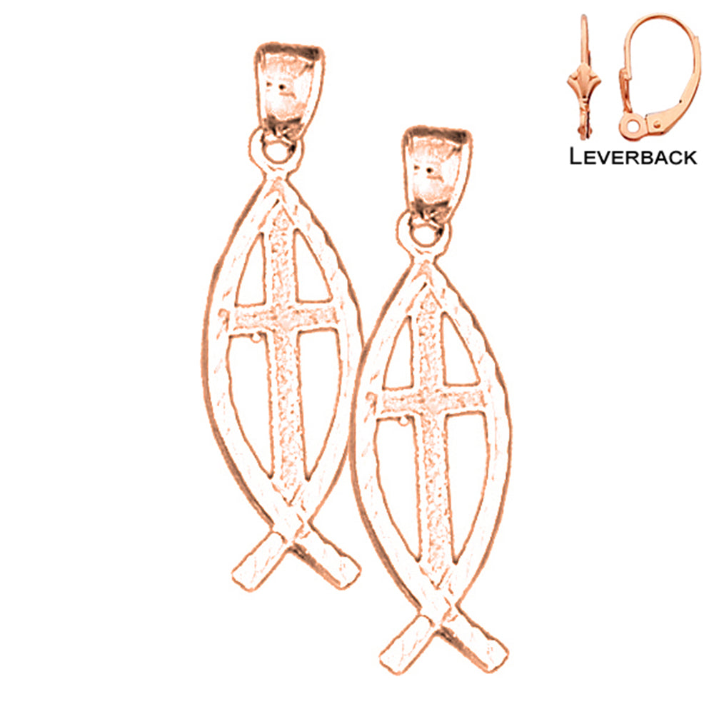 14K or 18K Gold 31mm Cross In Fish Earrings