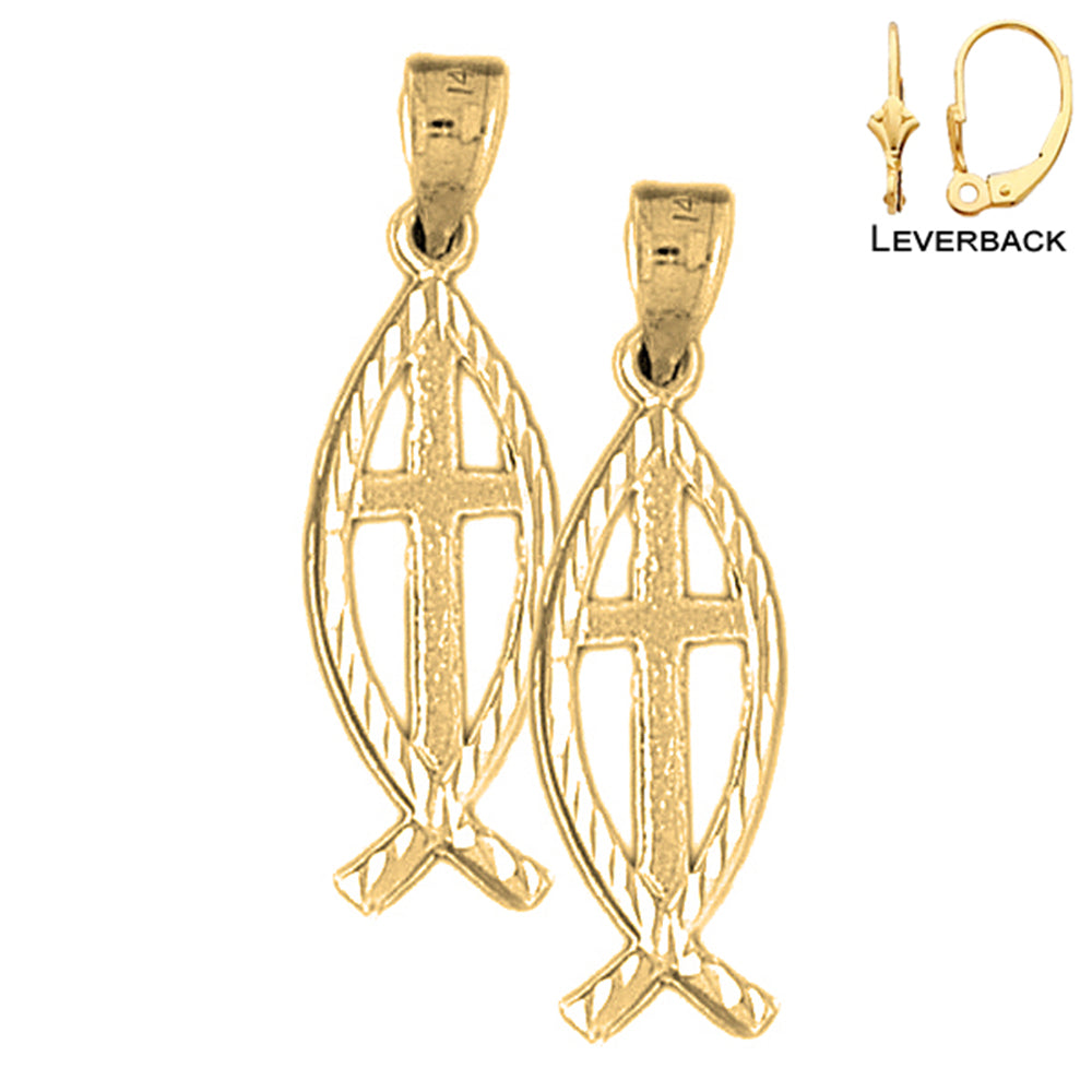 14K or 18K Gold 32mm Christian Fish With Cross Earrings