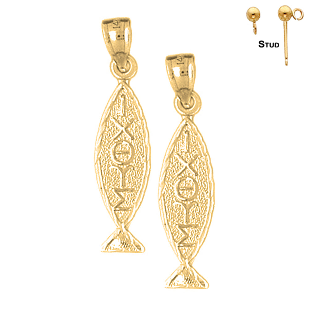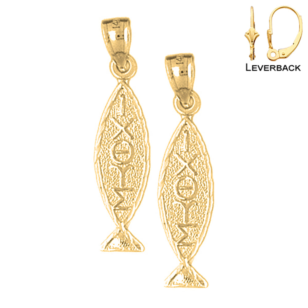 This is a gorgeous 14k yellow gold 32mm christian fish with oxeye earrings. This 14k yellow gold earrings measures 32 mm in length by 8 mm width. JewelsObsession creates all gold jewelry in our state of the art manufacturing facility.